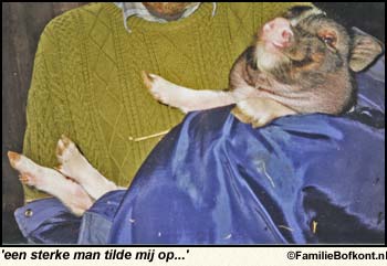 Maar de volgende ochtend werden drie van mijn broertjes niet meer wakker.' Mijn vader knorde bedroefd: 'Vrouw, nu hebben we nog maar 5 biggen over.' 'Dat komt door de stress,' zuchtte mijn moeder,' en ging languit liggen. 'Er waren toen ineens veel meer spenen voor ons.' Er gaat een huivering door alle dieren heen. Vooral door Theo. Die is ook gedumpt. Hij staat op en gaat gauw bij BabyBig liggen. Tegen haar warme lijf aan zijn die nare herinneringen meteen een stuk minder erg. Ze zijn er allemaal stil van. Billie wacht eventjes. 'Maar op een dag zijn we toch gevangen. Mijn ouders, Bessie en ik. De anderen zijn ontsnapt. We werden in kisten naar een grote schuur gebracht. Bessie en ik mochten niet bij mekaar, maar we kregen wel stro en lekker eten. Mijn ouders zijn later weggebracht. Ik hoorde ze morren en knorren toen ze de loopplank op moesten. Ik riep nog naar mijn moeder, maar ze hoorde me niet. Ik heb ze nooit meer gezien. 'En die andere biggen?' vraagt Aagje. 'Die zijn in dat bos achtergebleven. Daar wil ik maar liever niet meer aan denken.' 'En toen?' BabyBig wordt ongeduldig. 'Toen werd ik opgehaald door een vrouw met blonde haren. Een sterke man tilde mij op en zette mij achter in haar auto. Daar gingen we.' Alle dieren kijken elkaar aan. Ze weten allemaal wie die vrouw was. Zelfs Brutus...