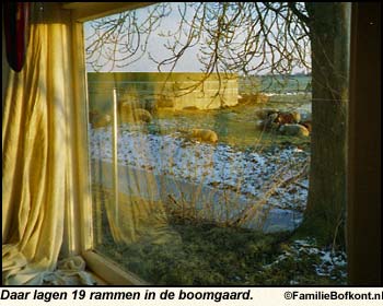 ![]() 19 RAMMEN Op die wonderlijk mooie zomer volgde een verschrikkelijk strenge winter. Het werk was nog in geen duizend jaar klaar. In februari 2006 heb ik de knechtenkamer provisorisch ingericht en Stinkwijfje, Mollie en Booswicht opgehaald. Het begon te vriezen dat het kraakte, overal lag sneeuw. Vanuit de polder kwam een ijzig koude wind opzetten. Op een ochend werd ik heel vroeg wakker. De bloemen stonden op de ramen. Ik krabde wat weg en keek naar buiten. Alles was grijs en wit. Sprookjesachtig. Maar wat zag ik daar? Ik kon mijn ogen niet geloven! Daar lagen 19 rammen in de boomgaard. Zomaar vanuit het niks. Ze lagen dicht tegen elkaar aan in de beschutting van de mestsilo. De wind vloog over ze heen. |