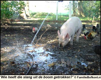 ![]() WATERBALLET Na een poosje schrikken ze beiden wakker van iets nats en kouds. Gedverdemme! Blijkt dat ze in een plas water liggen. De waterslang ligt op het pad te spuiten en de massagesalon is helemaal ondergelopen. Dat is de zoveelste keer. 'Wie heeft die slang uit de boom getrokken?' roept Dafne, maar in geen velden op wegen is er een schuldige aan te wijzen. 'Dat zal Gieltje wel weer geweest zijn,' moppert ze en ze gaat op zoek naar een hooivork, schep en kruiwagen. 'Hier ben ik de rest van de dag wel zoet mee,' roept ze naar Billie Bofkont. 'Dat wordt voorlopig geen leuke verhaaltjes meer vertellen. Ga jij maar door vanavond, dan pak ik later de draad wel weer eens op.' 'Ben je kwaad?' vraagt Billie beduusd. 'Ja, nee, |