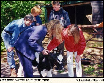 ![]() HET HALSTER 'Weet je nog dat we aan een halster moesten leren lopen?' herinnert Brutale Griet zich ineens. 'Dat leek Dafne zo'n leuk idee, dat ze met ons uit wandelen kon gaan'. 'Ja! op die Open Dag , toen zou ze een demonstratie geven', roept Rosa. 'Al die mensen om ons heen en wij wilden niet'. 'Waarom was die Open Dag?' vraagt Aagje. 'Nou dat was geloof ik per ongeluk', zegt Griet. 'Ze had in een managementtijdschrit gezegd dat ze dat van plan was. Dat had de Volkskrant toen overgeschreven. En toen dat zwart op wit stond kon ze er niet meer onderuit'. 'Dus toen kwam die Open Dag op 1 juni 1997. Al die mensen om ons heen. En Zachte Kees was zoek. Die stomme mensen hadden de deur van het schuurtje open laten staan en toen was ie naar buiten gefloept. Dafne was helemaal in |