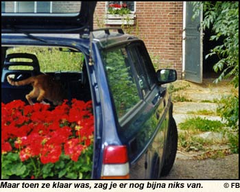 ![]() 1000 GERANIUMS In die zomer logeerden er ook nog een stuk of 10 kalfjes hier, zegt Brutale Griet. Die waren op een dag uitgebroken en toen liepen ze allemaal door de voortuin heen te springen. Ja, dat weet ik nog, roept Rosa. Ze vraten eerst alle Vlijtige Liesjes op. Weet je nog Griet, die ontzettend grote bak helemaal vol met die rode bloemetjes? In een klap was alles weg. Dafne heeft toen allemaal nieuwe planten gekocht. Knalrode geraniums. Het moest per se een bepaalde kleur rood zijn, anders was het niet goed. Stad en land liep ze af voor die kleur. Op een dag kwam ze thuis met 100 rode geraniums. Maar toen ze klaar was, zag je er nog bijna niks van. Het is hier zo groot, het verdwijnt in het niks, zei ze. Toen zette ze de oude boerenkar in de voortuin vol met potten geraniums. Kijk, dat begint er op te lijken, zei ze. Dat stond zo mooi, dat alle mensen er naar wezen. |