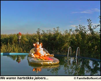 ![]() HET ZWEMBAD Wat zag ik daar? herhaalt Brutale Griet nog een keer. Dafne. Op een luchtbed! In een zwembad! Ja, zegt Rosamunde, dat bad lag midden in de maisvelden. En het was een rotzomer, knort Aagje. Ja, dat was ook zo, maar in augustus werd het ineens toch nog warm. Bloedheet. Dat heeft weken geduurd. En toen was dat bad daar ineens. We waren hartstikke jaloers, want wij wilden ook wel in dat water staan. Ze had er een tafeltje naast gezet en daar lagen haar spullen op. Dit is mijn pool-office, riep ze. Overdag zat ze daar te bellen en te doen. Of ze lag op dat luchtbed te dobberen. |