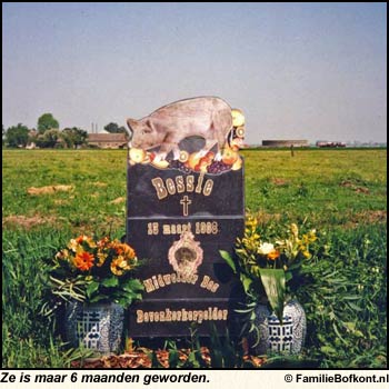 'Wat moet ik nou doen?' vroeg Dafne zich af. Ik kan natuurlijk autopsie laten doen. Autopsie? vraagt Brutus. Wat is dat? Dan zouden ze Bessie opensnijden om te kijken waar ze aan dood gegaan is, zegt Billie. Maar dat wilde Dafne toch liever niet. Ik krijg Bessie er niet mee terug, zei ze. Bessie hoort hier. De dierenarts zei niks. Hij deed maar net of hij het niet gehoord had. Bessie begraven, mocht niet. Ze liepen nog even samen naar mij toe. Ik stond daar maar wat in de melkerij. 'Er moet wel zo snel mogelijk een ander varkentje bij voor hem', zei de dierenarts. En weg was ie. Dafne heeft toen lekker veel stro voor me opgestrooid en ik kreeg allemaal appels en andere lekkere hapjes. De volgende dag is Bessie nog in de kamer gebleven. Daarna heeft Dafne haar in de melkerij gelegd. Daar was het lekker koud. Drie dagen boven de grond. Zo deden de mensen het vroeger ook, zei ze. Dan neem je de tijd om afscheid te nemen. Op de vierde dag is Bessie begraven. Achter Villa Varkensgeluk. Op een mooi plaatsje met haar kopje naar de polder toe. Dafne gooide eerst een laag stro in het gat. Daar kwam Bessie op te liggen. Ze helemaal afgedekt met hooi. En daar weer aarde overheen. Een paar dagen later was haar grafzerkje klaar. Bessie's foto en haar naam stonden erop. En ook nog waar ze geboren was: Het Midwolder Bos. Bessie †13 maart 1998. Ze is maar 6 maanden geworden.