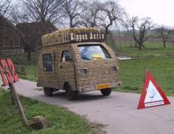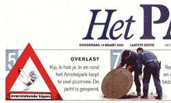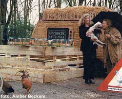 in de laadbak, en hup, op naar de actieplek."Ha, ik zag u vanmorgen al langs komen met uw wagentje, een gekke kip achter het stuur........", zegt buurtbewoonster E. de Graaf die de instant actieboerderij aan het Amsterdamse Amstelpark passeert. "Wat is er toch aan de hand?" Westerhof:"Ik voer actie voor de kippen. Heeft u soms last van de kippen?" Nee, de Graaf heeft geen last van de kippen. "Ze maken geen herrie, maar ze zijn wel potentieel gevaarlijk." Dat vindt de Amsterdamse deelraad Buitenveldert ook. Die kippen van het Amstelpark doen maar wat. Bij het krieken van de dag gaan ze met z'n allen de stad in. Ze steken de drukke Europaboulevard over, ze scharrelen op parkeerplaatsen, tussen vuilnis van flatbewoners, en hangen rond bij het pompstation. Volgens de deelraad komen daar nog ongelukken van. Wat als auto's op de rem gaan staan om een stadskip te ontzien? Vanaf woensdag worden de kippen dus gevangen. Ze worden verkocht aan liefhebbers, of diervriendelijk afgeleverd bij de poelier. "Ja, dat er 30 kippen bij het pomstation scharrelen, dat is wel wat veel",zegt Westerhof. "maar dat komt doordat mensen ze daar voeren. In het Amstelpark zijn 200 kippen, het worden er steeds meer. Er is niets bedacht om de kolonie in te perken. Maar er moet iets gebeuren. Als je kippen hun gang laat gaan, dan loopt het uit de hand." De oplossing van deelraad Buitenveldert spreekt Westerhof niet aan. "Hoewel ik moet zeggen, de jongens die hier vanmorgen kippen hebben gevangen, dat waren innerlijk beschaafde mensen. Maar er zijn alternatieven. Ik dacht eerst aan het castreren van de hanen, maar dat kan niet. Als je een haan castreert, dan wordt hij eigenlijk een heel vette kip. Hij komt onderaan de pikorde en dat kun je zo'n beest ook niet aandoen." Westerhof, behalve stadsboerin uit de P.C.Hooftstraat ook communicatie-adviseur, heeft een beter plan. " Als die deelraad nu eens met omwonenden projecten op gaat zetten. Kunnen buurrbewoners niet worden aangesteld als kippenhoeders? Hartstikke leuk! Kunnen ze nestkasten plaatsen, om de eieren weg te halen." Westerhof heeft zat goede ideeen. De beschermvrouwe liet al eens een scharreltram door de Amsterdamse binnenstad rijden en parkeerde een 'boerderij-kijkdoos' in de P.C.Hooftstraat. Westerhof: "Ik ben een stadse dame maar ik wil dat de dieren het goed hebben, en nu moet ik even mijn lam de fles geven." Robert van Gijssel uit Het Parool van 14 maart 2002