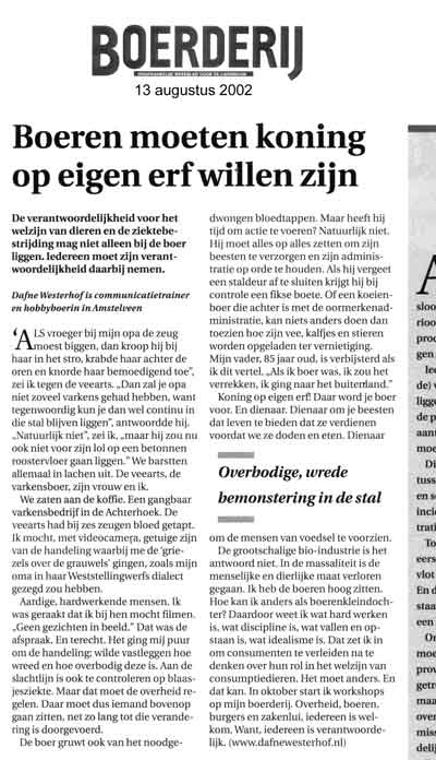 Koning op eigen erf? In mijn onderstaande bijdrage aan het landbouwblad 'Boerderij' van 13 augustus 2002 zijn een paar zinnen gesneuveld, die ik wel essentieel vind. Het gaat om het volgende: 1. De oorspronkelijke kop van het artikel was: Koning op eigen erf? Dit omdat ik juist vind dat de boer het recht heeft om koning op eigen erf te zijn en hij hier tegenwoordig door alle regels de kans niet meer toe krijgt. 2. Verder de gesneuvelde zinnen bij de alinea: Koning op eigen erf! Daar word je boer voor. En tevens dienaar. Dienaar om je beesten dat leven te bieden dat ze verdienen voordat we ze doden en opeten. Dienaar om de mensen van voedsel te voorzien. Want als er geen boeren meer waren zou iedereen verhongeren. Dan zouden we zelf weer met een speer achter de wilde zwijnen aan moeten jagen. ![]() | mail | hoofdmenu | |
