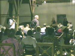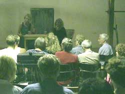 Hamming plaats bij mij op de Stallen van Westerhof. We hadden er een heuse bioscoop van gemaakt. Projectiescherm, beamer, 50 stoelen en als er nog meer volk zou komen dan konden er nog strobalen aangerukt worden. Het is een geweldige avond geworden. Josephine kan er wat van. Al eerder viel ze in de prijzen met een Emmy Award voor haar 'rode mieren' film. Tijdens de MKZ crisis werd ze gegrepen door het leed dat de boeren werd aangedaan om zonder pardon hun gezonde bedrijven te 'ruimen'. Ze sloeg aan het filmen en verzamelde zo'n 50 uur materiaal. Daar heeft ze een fantastische documentaire van gemaakt. Specifiek gericht op de melkveehouders, omdat zij het meest bij hun dieren betrokken zijn vanuit hun familietraditie. De film heeft een goede balans tussen emotie en feiten. Omdat ik zelf diverse protestmarsen tijdens de MKZ organiseerde kwam ik Josephine bij toeval tegen in Apeldoorn, waar ik de presentatie deed van de Stille Tocht op 9 juni 2001. En wie kwam daar aan met een grote camera op haar schouder? Josephine Hamming. We keken elkaar aan en gaven allebei een gil. Want 20 jaar geleden zaten we allebei op een cursus scenarioschrijven. Daarna verloren we elkaar uit het oog. PREMIERE AVOND Het hek ging om 19.30 uur open en de meesten waren vroeg. Het was prachtig weer en iedereen maakte eerst uitgebreid kennis met de beesten en waren stomverbaasd om zo'n idyllische plek aan te treffen pal onder de rook van Amsterdam. De schrijver J.J. Voskuil kwam op de fiets uit Amsterdam en poseerde uitgebreid voor de foto met mijn zeug Vrouw Vos, die naar hem vernoemd is. Ten tijde van de varkenspest richtte hij de stichting Varkens in Nood op en sindsdien hebben wij contact en is hij samen met zijn vrouw Loesje trouwe fan van mijn dierenacties. Hij vertelde dat hij Brinkhorst had opgebeld tijdens de MKZ crisis. Daarna publiceerde hij een stuk in Trouw, waarop Brinkhorst in woede ontstak en hem liet opbellen met de mededeling dat hij nog nooit in zijn hele leven zo kwaad op iemand was geweest. Voskuil vertelde me dit met een olijke twinkeling in zijn ogen. Professor Smalhout was van de partij, het CDA tweede kamer lid en dierenarts Henk Jan Ormel, Daan Kerkvliet van de NMV, boeren die 'geruimd' waren en in de film meespeelden, burgers uit het hele land, Diet, Hendrien en Aartje van Ent Eruopa, Marianne van de Engel van Gebundelde Krachten, Co Scholten, Jos V., Marianne Berga, Klazien, Ton Koster, allemaal van nieuwsgrazer, Tilly en Trudie van Boer en Vee, de viroloog Paul Sutmoller, iemand die op MKZ afstudeert, journalist Merel Ligtelijn, kortom bij elkaar zo'n 80-100 betrokkenen. De film maakte zo veel indruk, dat er na afloop eerst een korte pauze werd ingelast. Toen de discussie. Dynamisch en inhoudelijk erg goed. Vooral Hendrien Bredenoord, 'meespeelster' in de film en erg actief met haar familie voor Ent Europa, was zeer op dreef. In de film vertelt ze over hun familiebedrijf en dat het zo moeilijk is na de 'ruiming' de draad weer op te pakken met het nieuwe vee, want de ene koe is de andere niet. Op het hoogtepunt heb ik afgesloten. Henk Jan Ormel vertelde dat hij wel een kentering merkte ten gunste van het entingsbeleid en dat hij ervanuit ging dat met een meerderheid van de tweede kamer etc.etc. "Geef hem snel een tape mee" stootte ik Josephine aan. We vroegen hem om de film aan iedereen in de tweede kamer te laten zien. Dat zou hij gaan doen. Enthousiaste, gedreven man. Uiteindelijk sloot ik af met iedereen te vragen zijn eigen verantwoordelijkheid te nemen en de vleeseters aan te sporen biologisch scharrelvlees te (gaan) eten. Maar niemand kon wegkomen. De sfeer van de avond was zo goed en de verbondenheid onder elkaar erg groot. Iedereen bleef maar met elkaar doorpraten. Het hield maar niet op. Voskuil werd op een gegeven moment met fiets en al naar huis gebracht, het was al erg laat en donker. Ook hij kreeg een tape mee, waar hij erg blij mee was. Zei nog dat de film op televisie vertoond moet gaan worden, want 'iedereen moet deze film zien'. Josephine, haar man / producer Paul en zus Annemiek gingen pas om half twee weg, uitgeleide gedaan door mijn tamme gans Arie. Hij stal de show. Toen ik de avond opende, waggelde hij de stal in omdat hij mijn stem herkende en luid begon mee te gakken. Hij is toen voor de eerste rij gaan liggen, heeft de hele avond het hoogste woord gehad en werd zodoende de ster van de avond. Ik krijg nu nog mail over hem. De filmvertoning inclusief nabespreking kan voor groepen op aanvraag georganiseerd worden. | mail | hoofdmenu | |