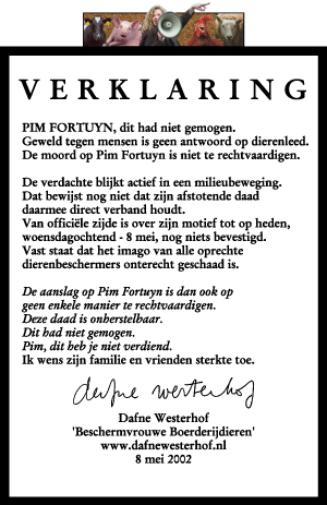 Op maandagochtend 13 mei is Dafne op Radio 1 in het programma De Ochtenden. Zij wordt tussen 11.15 en 11.45 uur door Thijs van den Brink geïnterviewd over onderstaand persbericht en verklaring. Dafne Westerhof, beschermvrouwe van boerderijdieren, heeft haar ludieke verkiezingscampagne: STEM OP DE DIERENPARTIJ.NL voortijdig gestaakt i.v.m. de moord op Pim Fortuyn. Daarom is site dierenpartij.nl op 'zwart' gezet. In plaats daarvan heeft zij in Rotterdam en Hilversum borden geplaatst als deelneming in deze dramatische gebeurtenis (zie onderstaande verklaring en foto's). Dafne Westerhof Dierenacties opereert autonoom en onafhankelijk van de gevestigde dierenbeschermingsorganisaties en milieubewegingen. communicatie-adviseur en 'Beschermvrouwe Boerderijdieren' 06-53733267 of mail@dafnewesterhof.nl ![]() ![]() ![]() ![]() |