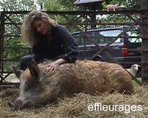 Ik bedacht me dat ik cursussen klassieke massage had gevolgd voor mensen. En hoe rustig en ontspannen die massages altijd werkten. Bovendien heeft dat op jezelf ook een goed, kalmerend effect. Aan de slag dus met die kleine onruststoker. Ik begon de varkensmassage-sessies en gebruikte dezelfde technieken als bij de mensen. Vooral de lange strijkbewegingen en de vibraties deden haar kleine biggenlijfje goed. Aagje knapte zienderogen op. Al gauw ben ik toen ook BILLIE BOFKONT en VROUW VOS op deze manier gan verwennen. Even kriebelen op hun geheime varkensplekje, onder de voorpoten, en hup daar vallen ze al slap neer, klaar voor de grote verwen-sessie.Schaamteloos Genieten