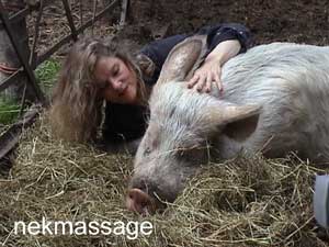 AAGJE is inmiddels een kolossale zeug van 4 jaar en ik masseer haar nog steeds. Als ze helemaal ontspannen is kan ik helemaal op haar grote lijf gaan liggen, dat vindt ze heerlijk. En ik ook! MANNETJE BROMSNOR is sinds oktober ook van de partij. Hij laat zich al deze heerlijkheden eveneens goed bekomen. Het bijzondere van deze varkensmassage is het intens fysieke contact dat je dan met je varkens hebt. Daardoor leer je ze steeds beter kennen. Iedere keer sta ik weer versteld hoe fijngevoelig en besnaard deze dieren toch zijn. En hoe verschillend deze unieke persoonlijkheden zijn. En hoe schaamteloos ze zich kunnen overgeven. Varkens kunnen genieten als geen ander. Wat een geluk om temidden van deze beesten te kunnen leven.![]()