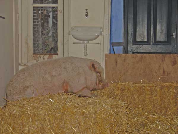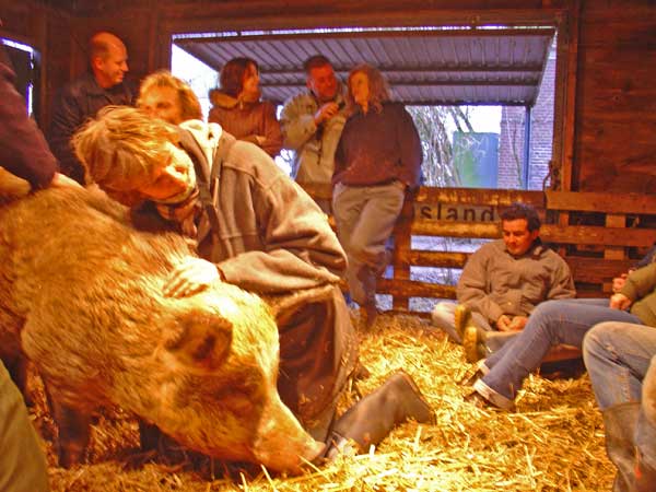 De Dag van Teun van 538 ![]() M. liet zich vanochtend achter z'n oortjes kriebelen. Ik heb besloten om het heel rustig aan te gaan doen met hem. Misschien doe ik voorlopig wel eens helemaal niks. Ga ik over een poosje op een stoeltje een boek bij hem lezen of zo. Het is pionieren, dit heb ik natuurlijk ook nog nooit bij de hand gehad. Het maakt het wel interessant om af te wachten of hij ooit nog vertrouwen krijgt en kan schenken. Maar het begint bij mij. Ik moet ook weer vertrouwen in hem zien te krijgen. We staan dus quitte. Vanmiddag workshop. Aagje lag prinsheerlijk onder de warmtelampen. Mooi gezicht met dat prachtige licht. Leek wel een kerststal. Miss Piggy stal de show, liet zich aan alle kanten verwennen, net toen Teun van radio 538, die er ook bij was voor de eerste keer de uitzending in moest met mij. Hij maakt een zaterdag- en zondagmiddagprogramma, waarin hij steeds de boer op gaat naar een of andere bijeenkomst. Hij deed het leuk. Na afloop is hij nog een poosje gebleven, was echt geinteresseerd geraakt. Daarna vliegensvlug voeren, douchen en naar het feestje van Belinda Meuldijk, die een kalender heeft gemaakt voor haar goede doel: de Underdogkalender. Hier en daar wat gezwaaid en handen gegeven en niet lang gebleven want ik zit met een deadline voor een paar stukken die af moeten, o.a. voor op de site van de KRO over de oormerken. Zaterdag 11 december 2004 De Dag van De Arme Kwaaie Pier ![]() Toen ik gisteravond nog heel laat ging kijken hoorde en zag ik niks. Een dikke bult stro achter in zijn stalletje, dus daar zou hij dan wel onder liggen. Zij nieuwe huis is onderveer 6x8 meter. Lekker ruim met voor een deel transparante platen in het dak, dus veel licht. Aan beide kanten deuren. Daar zijn nu halfhoge schotten voor geschroefd. Dat is handig. Je kunt de deur opendoen zonder dat hij er uitfloept en je staat zelf veilig. Want toen ik vanochtend ging voeren, stormde hij al weer in de aanvalshouding op me af. Op zich een goed teken. Het gaat dus goed met hem na de operatie. Ik had pijnstillers en antobioticatabletten in druiven verstopt. Die heb ik met de hand gevoerd. Dat ging goed. Maar na de eerste druif trapte hij er niet meer in. Hij liet ze zo uit z'n bek vallen en de hanen hebben toen gesmuld van een antibiotica-bonbon. Een boterham met pindakaas ging beter. Als die pillen er maar in gaan. Door een van de schotten kan hij zijn neus steken en dat doet hij maar wat graag, omdat hij Miss Piggy dan kan ruiken. Dan wordt hij meteen weer wild. Verder een begin gemaakt met zijn oude huis op te ruimen. Het stinkt er helemaal naar beer. Peter K. belde nog hoe het gaat. Benadrukte nog eens dat M. nu nog 5 weken in staat is om zich voort te planten. Eerst maar eens een goed hek aanbrengen rondom de uitloop, dan kan hij binnenkort een frisse neus gaan halen. Vrijdag 10 december 2004 De Dag van De Operatie ![]() De melkerij is veranderd in een operatiezaaltje. De castratie heeft al uren geleden plaatsgevonden maar het ruikt nog helemaal naar desinfecteringsspul, je waant je in een ziekenhuis. Godzijdank liet Maximiliaan zich benaderen op het moment dat hij verdoofd moest worden. Dat was vanochtend nog absoluut niet het geval. Ik hield er zelfs al rekening mee dat hij 'gedart' zou moeten worden. (verdoving via een geschoten pijltje). Dat zou geen punt geweest zijn voor dierenarts Peter Klaver die normaliter met exoten werkt. Het was een echte operatie. Peter had een assistente meegenomen. Het ging goed. Ik kon filmen en foto's nemen en D. heeft meteen z'n tanden een stuk ingekort. Vorige week was ik er nog zo op tegen, nu is het pure noodzaak voor eigen veiligheid. Dat lijkt zo lang geleden, vorige week toen alles nog koek en ei leek. Nu heb ik er een nachtmerrie-achtig gevoel over. Peter had ook geen idee hoe het nu verder zou gaan en of het ooit nog goed komt. We houden er rekening mee dat hij net als een wild beest in Artis achter de 'tralies' zal moeten. D.w.z. een hok of stal met stevig hekwerk, een uitloop en een handig systeem om even snel wat voer en water binnen te zetten. Een keer in de week het hok uitmesten, terwijl Maximiliaan dan achter een hek zit. Zoiets. Hoe anders had ik het me voorgesteld... Maar wie weet, wie weet, pakt het nog anders uit. Nadat zijn ballen keurig naast elkaar op een stukje papier lagen, ging Boy George bovenop Max liggen. Mooie foto's kunnen maken. Daarna hebben we Max met brancard en al op een dolly gehesen en naar het witte huisje gereden. Daar gaat hij voorlopig wonen. Gisteravond als een gek dat nog in orde gemaakt, een grote schoonmaakbeurt, allerlei losse troep en rommel verwijderd, bergen nieuw stro aangesleept en de deuren aan de binnenkant goed gebarricadeerd. Ik kan nu makkelijk eten en drinken brengen zonder dat ik naar binnen hoef. Peter raadde aan om altijd een kort stuk hout bij me te hebben, zodat ik daarmee in geval van nood op z'n ogen kan slaan. Het is te erg voor woorden dat ik daar rekening mee moet houden. Ik zie mezelf dat ook niet doen. Maar een kwaaie beer is levensgevaarlijk, zei Peter en je hoeft niet te denken dat je dat ooit van hem wint. Een hond kun je nog vermanend toespreken en laten merken wie de baas is, maar met een varken - en zeker met een beer - kun je dat vergeten. Wie weet komt het nog goed. Het duurt ongeveer 4 maanden om te zien of de castratie gewerkt heeft. Als het allemaal goed gaat kan hij dan ook naar buiten met een ruime uitloop. Om 20.00 uur was hij nog niet helemaal uit de narcose en toen ik om 22.00 uur nog weer eens ging kijken zag ik helemaal niks dan stro. Ben benieuwd hoe ik em morgen aantref. Donderdag 9 december 2004 De Dag van Monster Maximiliaan ![]() Maximiliaan Westerhof kreeg een leuke kaart. Er zijn al vele kaarten op de mat gevallen voor de Heer Maximiliaan Westerhof. "Lieve Max, doe maar rustig aan en verken je nieuwe huis maar eens rustig hoor! Je vrouw heeft alleen het beste met je voor..." Tja, wat zal ik zeggen? Vandaag heb ik een heel andere Max leren kennen en ik ben me ro