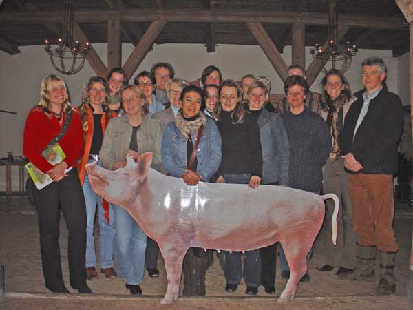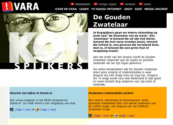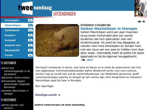 De Dag van Het Uitgestelde Feestje ![]() Vandaag had Maximiliaan dus aanbeden en bewonderd kunnen worden. Er belde nog iemand op en Kokkie - buurtgenoot - kwam nog even aan. Verder is de schade beperkt gebleven. Dat wil zeggen dat er niemand vergeefs kwam. Het heeft al die tijd wel luid en duidelijk op de site gestaan maar lang niet iedereen heeft internet, lezen het in de Telegraaf, etc. Kokkie was op de fiets en had weer een muts met 5 piepkleine kuikentjes in zijn rugtas zitten. Die wilde hij alleen maar even laten zien. Wat een schatjes weer. Hij bracht hier met het feestje van Miss Piggy ook 3 van die kleintjes mee. Dat zijn nu de 3 musketiers geworden. Al grote uit de kluiten gewassen nozems die altijd samen zijn. Kippen zijn echte family dieren, die zullen elkaar nooit in de steek laten. De 5 piepkleine kuikentjes zijn in een onmogelijke tijd van het jaar geboren. Veel te koud. Vandaar dat hij ze in huis had genomen. Het was natuurlijk wel zijn bedoeling denk ik om ze hier te laten. Dat was ook erg verleidelijk, maar het komt nu niet goed uit. Veel te druk met Maximiliaan en de rest van de Familie Bofkont. Maar hij verzekerde me dat dat niet de bedoeling was, alleen maar om te laten zien. Toen hij weer wegfietste vroeg ik me af of die kleintjes niet zouden stikken in de rugzak. Of stel je voor dat hij bij thuiskomst die rugzak in de hoek zou zetten en ze helemaal zou vergeten? 'Zet het van je af Westerhof' zo sprak ik mezelf toe. 'Het is niet jouw verantwoording, je kunt niet alle dieren van de hele wereld redden'. Dat moet ik maar heel vaak gaan herhalen, want het dat beeld van die schattige kuikentjes krijg ik niet meer van mijn netvlies af. Martien, de schaapsherderin belde. Ze is nu al weer aan het plannen voor de lammetjestijd, die al begin januari begint. Ik ga eind februari, begin maart, dan zijn er al volop, de laatste ooien staan dan op springen en die die gaan we dan samen verlossen. Ik verheug me er al op. Zaterdag 18 december 2004 De Dag van Saakje & Maximiliaan ![]() bron: kopspijkers.nl - voor filmpje klik hier Een gedoe vanochtend. Moest een gastles geven voor de Sophia Vereeniging ter Bescherming van Dieren. Was er geen sleutel van de school waar we in moesten (Amsterdam West). Daar stond ik met model Aagje onder mijn arm op de stoep. Gelukkig woonde een van de cursisten in de buurt. Een piepklein schattig huisje, begane grond godzijdank, anders had ik Aagje niet door het smalle trappengat omhoog gekregen. Daar overvielen we twee mensen die net aan het ontbijt zaten. Het was zo klein dat we eerst moesten blijven staan. Maar de gastvrouw improviseerde snel een tv en videorecorder bij mekaar en toen zijn we allemaal op de grond gaan zitten. En het werd verschrikkelijk leuk! Ik gooide de inhoud van mijn tas leeg en trok de ene na de andere foto van de Familie Bofkont omhoog en heb daar het hele verhaal omheen gebouwd. Halverwege moest ik nog live in een radio-uitzending over Maximiliaan. Maar dat kwam goed uit, want ik was toen net zo'n beetje op het punt om zijn verhaal uit de doeken de gaan doen. Heel leuke ochtend dus. Saakje, het ex baasje Van Maximiliaan is langs geweest. Het was een mooi moment. Toen ze hem riep, schoot hij uit het stro omhoog en kwam onmiddellijk op haar toe. Ze heeft hem achter zijn oortjes gekriebeld vanachter het schot en dat deed hem zichtbaar goed. Toen hij er genoeg van had, draaide hij zich om en ging weer in zijn slaapnest liggen. Het lijkt of hij meer op zijn gemak komt. Is hier nu ook al weer meer dan 14 dagen. We hebben nog naar Kopspijkers gekeken. Maximiliaan is derde geworden in de verkiezing 'Zwatelaar van het Jaar'. Het werd slordig aangekondigd door Jack Spijkerman. "Die jongens van die varkens". Dat klinkt onverschillig. 'Die studenten van varken Maximiliaan' had meer recht gedaan. Saakje vertelde dat ze inmiddels was opgebeld door de beheerder van de kerk. Die had nog een heel verhaal. Nou allemaal redenen om het een en ander eens goed uit te gaan spitten. Maandag ga ik er mee beginnen. Wordt Vervolgd. Vrijdag 17 december 2004 De Dag van Hoe Bestaat Het ![]() bron: Schotse Hooglander Stichting Vanochtend naar de rechtbank geweest. Natuurmonumenten moest voorkomen omdat er een paar runderen zonder oormerk liepen in een van hun natuurterreinen. Een paar weken geleden had in de krant gestaan dat ze ook wilden chippen. Maar tot mijn stomme verbazing hadden ze geen advocaat (waarom in godsnaam niet, ze hebben heel veel geld!) en eigenlijk ook geen case. Hoe bestaat het! Het is een heel verhaal maar het komt er op neer dat in hun geval chippen helemaal niet gunstig is, omdat ze moeten kunnen zien welk kalf bij welke moeder hoort. Het schijnt dat bij die (semi) wilde kuddes de kalveren in een groep bij elkaar leven en af en toe naar moeder gaan om te drinken. En dat moet ja dan maar net zien. Dat lukt dus niet in zo'n natuurterrein. Dat wist ik niet. Ik dacht dat moeder en kalf altijd samen waren. Nee dus. Ze moeten nu een boete betalen. Het goede nieuws is dat de officier van justitie zei dat er wel gelobbyed moest gaan worden in Brussel om kenbaar te maken dat er een alternatief moet komen voor het oormerk. Wat een gemiste kans van Natuurmonumenten. Ze hadden met een avocaat op basis van mijn jurispredentie de kwestie makkelijk kunnen winnen lijkt me. De rechter was niet van kwade wil, en toonde gemeende interesse. Maar het lijkt waarschijnlijker dat in dit geval mensenwelzijn had moeten preveleren boven het oormerken. Het is namelijke levensgevaarlijk om deze beesten te benaderen, zeker als ze jongen hebben. In de normale veehouderij worden er per jaar al ongeveer drie boeren gedood door Moeder Koe als ze haar kalf willen oormerken, laat staan bij deze oerrunderen... De middag is helemaal opgegaan aan het geven van het interview aan het nieuwe blad 'Dierenarts in Beeld'. Het was al donker toen we nog even een rondje dieren gedaan hebben. Toen ik later de voicemail afluisterde stond Hart van Nederland er op over Maximliaan. Dat ko