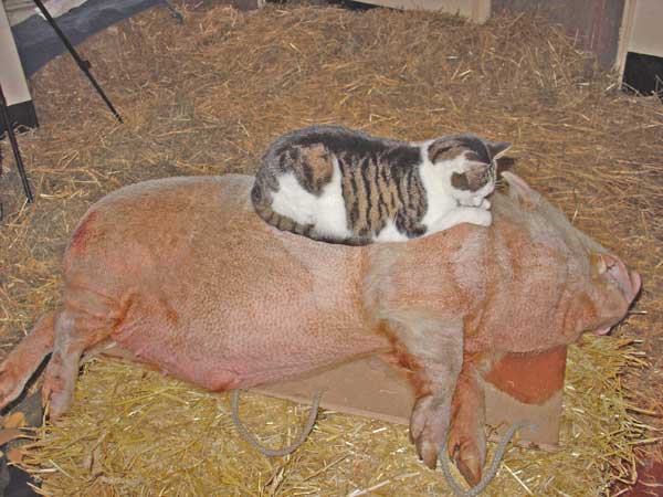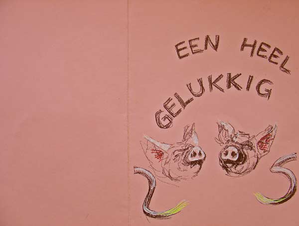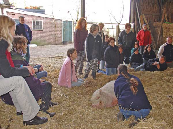 De Dag van Hoe Moet Het Nu Verder? ![]() Mooie workshop. Maximiliaan stal de show. Hij lag in het midden, bijna 30 man in adoratie om hem heen, een meisje met toverhanden kreeg hem vrijwel onmiddellijk plat. Vrouw Vos en Aagje zijn van slag omdat Maximiliaan er nu is. Vrouw Vos begon van opwinding te piesen en Aagje mocht van haar de massagesalon niet meer in. Keizer Maximiliaan voelt zich helemaal thuis. Hij loop overal naar toe, is vriendelijk en ontspannen. Stalker mijdt hem en verder is er hier en daarnog wat gekift, maar het valt erg mee. Leuke mensen. Een clevere man vroeg zich af hoe het het verder zou gaan en of ik een volgende stap zou gaan maken. Alsof hij het rook! Ik heb gezegd dat er inderdaad nieuwe plannen op stapel staan. En dat iedereen die interesse had zich kon inschrijven, omdat ik binnenkort een open dag hou om de nieuwe plannen te presenteren. Ook boden veel mensen hulp aan. Nou wie weet hoe het zich allemaal nog gaat ontwikkelen... Zaterdag 8 januari 2005 De Dag van Hij kwam - Hij zag - Hij overwon ![]() Maximiliaan is naar buiten geweest! Ik vond dat het tijd werd. Vier weken geleden gecastreerd, alsmaar binnen gezeten, Miss Universe net berig af- alles bij elkaar dacht ik, vanavond moest het maar van komen. Alsof hij het voorvoelde. Toen ik hem vanmiddag vers hooi bracht was hij al door het dolle heen van blijdschap. Hij draaide pirouettes als een jonge big, liet zich er languit in vallen en rende met het hooi in zijn bek in de rondte. Toen de plank voor z'n deur weggehaald. Hij liep meteen naar buiten. Eerst dacht ik nog, nou voorlopig even alleen in de ren, ik liep er een paar keer heen en op een gegeven moment was ie foetsie. Het gaas was al gesloopt en hij liep op het erf alsof hij nooit ergens anders was geweest. Het was al donker en alle dieren sliepen. Ik moest toch nog van alles doen, stal uitmesten en zo, dus ik kon het mooi in de gaten houden. En ja hoor, op een gegeven moment daar kwam ie aan. De slaapstal in. Brutale Griet rekte haar hals meteen een meter langer uit, zo nieuwsgierig was ze. Ze zag het meteen. Een nieuwkomer! Stalker schoot overeind vanonder zijn strobult. Mannetje Bromsnor zocht onmiddellijk dekking en Billie Bofkont week achteruit. Stalker er op af. Dat werd een heel stevige matpartij. Stalker z'n staart stond steil overeind. Kort maar hevig. Het lukte Stalker nog net om M. de tent uit te vechten. Maar buiten even later een rauwe gil en Stalker vloog weg. Maximiliaan is dus nu de baas. Hij ging daarna meteen bij Miss Universe slapen. Een echte oorlogsoverwinning dus. Het mooiste meisje van het erf werd meteen buitgemaakt. Vrijdag 7 januari 2005 De Dag van De Zotte Belgen ![]() 'Heb het bestuur helemaal zot van u gemaakt' mailde de organisator van de Belgische landbouwbeurs me vandaag. Wat hebben die Belgen toch een enig taaltje. Dat betekent dat ik nu officieel ben geboekt als de publiekstrekker en wordt als zodanig ook opgevoerd in de persconferentie. Wat een giller. Ik ga er de dag er voor al heen om alles op te bouwen, slaap in hotel 'De Bonte Os', en treedt dan op de eerste beursdag elk uur op van 9.00 - 19.00 uur. Doet me denken aan 1996, toen ik in Duitsland een voordracht moest houden over vrouwelijk ondernemerschap. Dat was ook zo leuk. Die Duitsers werden helemaal wild. Zelf zo formeel en altijd in het gareel was het kennelijk buitengewoon wat ik daar toen deed. Ik werd meteen gevraagd om workshops te geven in Oostenrijk. Hoewel ik toen veel makkelijker weg kon dan nu, omdat ik toen nog lang niet zo veel dieren had, heb ik dat niet gedaan. Verder belde de organisatie van de Landelijke Dierenopvang Dag. O ja. dat is waar ook, dacht ik, daar doe ik ook aan mee. Zondag al weer de eerste workshop 'Communicatie met het Varken'. Ik zit dit weekend met drie dead lines voor stukjes die nog geschreven moeten worden. En de SKBN (Stichting Kinderboerderijen Nederland) dag komt er aan, daar moet ik de dag een beetje in banen gaan leiden als dagvoorzitter, kortom het nieuwe jaar is gewoon weer begonnen dus. Donderdag 6 januari 2005 De Dag van De Dam & Giro 555 ![]() Gister kreeg ik het verzoek om vanavond op de Dam te verschijnen met de BB Bus om geld en aandacht te vragen voor de dieren in Azie. Na wat heen en weer gebel leek het beter om dat niet te doen. Dat kan beter op een ander, later moment. Het lijkt me niet goed om nu al de aandacht van de mensen weg te halen. Verkeerde timing. Aanvankelijk waren de berichten dat de dieren vanzelf al gevlucht waren en zich in veiligheid hadden gesteld. Maar dat geldt voornamelijk voor de olifanten en andere wilde beesten. Nu blijkt dat het vee en honden en poezen wel degelijk slachtoffer geworden zijn. Logisch, vee zit opgesloten, waar hadden die ook heen kunnen vluchten? Er moet wel iets gebeuren, maar nu nog niet. Bovendien er wordt ook al veel op internet gedaan aan inzameling. Ik vrees trouwens dat de dieren die daar nog rondlopen wel de pan in zullen verdwijnen als de mensen daar nog steeds niks of te weinig te eten hebben... Miss Piggy wordt aan alle kanten gefeliciteerd met haar uitgever(!). Haar grootste fan Myrte vroeg haar zelfs per mail of ze nu niet apentrots was. Ze loopt trouwens weer helemaal goed gelukkig. Nog een paar dagen, dan mag Maximiliaan voor het eerst naar buiten. De DierenBescherming wil nu trouwens dat de overheid quarantainestallen laat bouwen voor gedumpte hangbuikzwijntjes en werkt aan een dossier, las ik. Dat is helemaal de limit. Eerst het advies doodspuiten geven en dan dit. Ze voelen zich zeker schuldig. Dat ze nou echt niet wat creatiever en flexibeler kunnen denken en handelen als het er echt even op aan komt. Onbegrijpelijk. Hoe had Maximiliaan hier anders moeten komen als de AID ook niet had meegedacht aan een snelle oplossing? Daar kon in eerste instantie ook niks, maar uiteindelijk hebben ze zich cooperatief en praktisch opgesteld. Bovendien zit Maximiliaan wel degelijk ook in quarantaine, maar dan wel hier. Ik snap er echt niks van. Woensdag 5 januari 200
