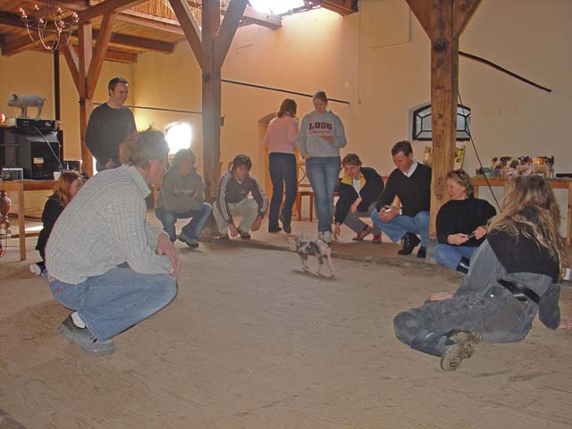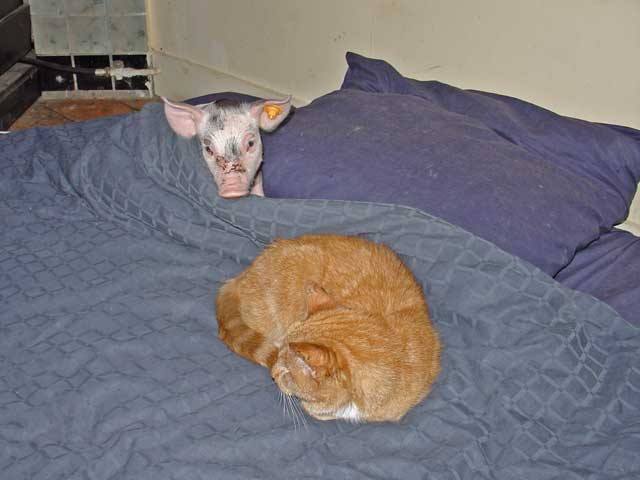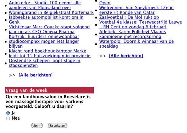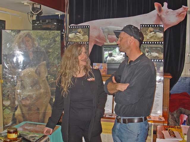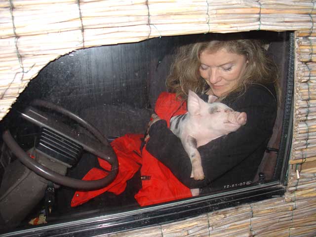 De Dag van 'Als Het Kindje Binnenkomt' ![]() Multatuli zou tevreden geweest zijn als ie de entree van Baby Big tijdens de workshop vandaag had meegemaakt. Iedereen was al binnen toen ik met Baby Big in mijn armen binnenkwam. Ik moest meteen aan de Camera Obscura (Multatuli) denken: 'Als het kindje binnenkomt'. Totale adoratie. Er was een vrouw bij die zich sinds kort orienteert op het leven van landbouwhuisdieren. Die viel met haar neus in de boter. Liefde op het eerste gezicht. Zal me niks verbazen als die nu ook van een eigen boerderij droomt. En BabyBig voelde dat ook meteen. Ze kroop meteen bij haar op schoot... Het is vreemd dat Lady Lolita weg is. Heb wel een hoekje voor haar gemaakt en het witte kipje zit er nog steeds te broeden, maar ik sta er letterlijk met lege handen want Lady Lolita hoeft geen appeltje meer om te smikkelen. Heb haar verhaal verteld, dat ik haar niet op eigen land kon begraven. Ik voel heel goed dat ze hier niet meer is. Zachte Kees, Mollie, Grijze Kat, Bessie (Billie Bofkont's zus) en alle anderen die zijn hier nog steeds. Want ze liggen hier begraven. Ze blijven er altijd bij. Maar Lady Lolita ia gewoon weg en dat verschil is heel goed merkbaar. Ik doe het nooit meer zo. Tussen de bedrijven door moest ik nog even de radio te woord staan voor een varkenspraatje. Toen ik alle namen opnoemde hoorde ik mezelf Lady Lolita ook nog zeggen. Daar moet ik dus nog even op oefenen. Vrouw Vos is geadopteerd! En Gevaarlijke Eddy! Leuk dat niet iedereen zich meteen op BabyBig en Maximiliaan hebben gestort. Trouwens BabyBig begint nu al haar onschuld te verliezen. Drie weken oud en Ik kan nu al niet meer ongepantserd in bed liggen. Ze is wild, wroet en bijt dat het een aard heeft en ontziet daarbij helemaal niks. Met scherpe, harde hoefjes loopt ze doodleuk over je gezicht heen en weer, probeert je tenen er af te bijten en stompt al zo hard met haar neus dat de blauwe plekken al weer te tellen zijn. T-shirt en lange broek moeten dus aanblijven. Het blote vel is te kwetsbaar om het bed te delen met zo'n rauwdauwertje. Zaterdag 5 februari 2005 De Dag van Zaal 100 ![]() Zelden zo'n leuke infomarkt meegemaakt. Zaal 100 in Amsterdam West. Een eetfestijn voor vega's en vege's en een aantal actie groepen die allemaal roepen dat er geen dierenleed mag zijn. Zoiets. Ik was uitgenodigd omdat de organisator mij op de televisie had gezien. Het zaaltje was klein, heel klein, de actiegroepen waren met veel. Dat betekende dat iedereen eenderde deel kreeg van een smal tafeltje. Iedereen was er weer. PvvD, Varkens in Nood, de Vegetariersbond etc. We keken mekaar verbijsterd aan. Dirk Jan van VIN en ik kregen de slappe lach en toen begon het improviseren. Eigenlijk moest je je spullen boven op je hoofd leggen, dat was ongeveer de enige plaats. Maar toen zag ik het licht. In de hoek van het zaaltje stond een piano. Die heb ik geannexeerd en heb er een flatgebouw van gemaakt. Stapelen dus. Samen met het stukje tafel werd het nog heel wat. DirkJan zat de hele avond vanwege ruimtegebrek met een rubber varken op schoot. Prachtig gezicht. De avond was enig. Nu blijkt hoeveel mensen Het Beloofde Varkensland en de Familie Bofkont kennen vanuit de media. Een moeder met een dochter van veertien hadden een schitterend verhaal. Dat meisje was op haar zesde jaar verliefd geweest op een Frans varken. Echt serieus verliefd. Ze wilde met hem trouwen. Daar ga ik nog over schrijven, dat kan niet anders. En ik had de avond van m'n leven want ik ben al meer dan 10 jaar op zoek naar een man die in de Cevennen woont met wilde varkens. Ik ging hem destijds opzoeken in 1994, maar moest door een zieke vriendin halverwege terug naar huis. Zijn adres ben ik kwijtgeraakt. Al die jaren ben ik er aan blijven denken, hoe jammer etc. Komt er gisteravond een vrouw langs en die heeft een poosje bij die man en zwijnen gebivakkeerd! Kastanjes rapen in de bossen voor de wilde varkens! Dat was ook al weer lang geleden, maar ze gaat zijn adres opzoeken. Dat wordt een reisje naar de Cevennen... Vrijdag 4 februari 2005 De Dag van Dierennieuws.tv ![]() Dierennieuws.tv. Slimme move van Henk om het zo te noemen. Iedereen denkt dus dat het op tv is. Dat is niet zo. Het is internet. Hij was hier vanochtend met z'n cameraman. 18 minuten film per uitzending. Daar draaien ze 2 dagen voor en daarna nog eens 3 dagen montage. Oei, dat is dus bijna een dagtaak. Liep te blaffen als een gek, droge hoest. Maar ik denk dat de opname wel wat geworden is. Aagje liet in ieder geval een paar keiharde scheten als dank voor de massage. Baby Big is een Blije Big. Ze speelt en rent en doet of ze met 12 andere biggen de boel onveilig maakt. BB - Bebe - Blije Big - Boze Big - Beauty Big - Boeren Big - Baby Big - Bijzondere Big - Bevrijde Big - Belgische Big - Bonte Big. Met BB kun je dus veel kanten op. Misschien blijft 't wel BB. Varkens in Nood had een house warming. Leuk onderkomen in een bedrijvencomplex op de Hoogte Kadijk. Jet - van Filosofie voor de Zwijnen - vertelde dat ze in de natuurwinkel was aangesproken over het overlijden van Lady Lolita! Han en Lousje Voskuil nog even bijgepraat over Rendac en zo. Hij informeerde hoe het toch met de gans ging, want toen Lousje bij mij was had ze hem niet gezien. Leuk dat de dieren zo leven bij iedereen. Ik was blij dat Baby Big er niet bij was. Heeeel eventjes had ik het overwogen, maar toen ik er was, dacht ik, nee toch veel te druk. Ze is vanochtend pas voor de eerste keer in de presentatiestal geweest. Dat was een hele belevenis. Maar ze is dapper. Als ze m'n stem maar blijft horen is het goed. Verder begint ze al behoorlijk te gillen als ze haar zin niet krijgt. Ik doe dan net of ik het niet hoor - wat niet eenvoudig is - want ik wil dat ze het meteen afleert. Volkomen negeren. Het helpt wel. De Belgische Vegetariersbond heeft om een interview gevraagd. Dat lijkt me wel interessant. Las trouwens dat er iets nieuws is. Vlees gemaakt uit melk, Hoe het kan weet ik ook niet maar het schijnt er hetzelfde uit