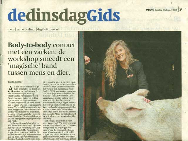 De Dag van Myrte's Mooie Tekening ![]() Godzijdank is Myrte's Tekening terecht! Dacht dat ie weg was. Ze heeft zo'n mooie tekening gemaakt van Lady Lolita die opstijgt naar de Varkenshemel. Nog steeds komen er reacties binnen op Lady Lolita. Dat doet me echt goed. Jaro, haar veertienjarige fan, schreef dat hij zo'n spijt heeft dat hij haar niet nog eens is komen opzoeken. Dat was hij al lang van plan, maar 't kwam er niet van. Ik zie hem nog bij haar zitten, zachtjes praten, een beetje smoezen. LL vond het prachtig, die aandacht. Later mailde hij dat hij helemaal verliefd op haar geworden was en hij altijd wilde komen helpen, al moest hij midden in de nacht op de fiets uit Amsterdam komen... Over oudjes gesproken. Willempie en Golden Girl zijn echte stokoudjes geworden. Ze zitten de hele dag een beetje te dutten en zijn niet tot veel meer in staat. Ik vrees dat ze het niet echt lang meer maken. Vanmiddag had Golden Girl zo'n bleek kippensmoeltje. Dan gaat het meestal heel snel, als ze van die bleke koppies krijgen. Ik probeer ze nog zoveel mogelijk te verwennen. Lekkere zachte kattenbrokjes uit blik vinden ze heerlijk. Willempie zit graag bij de warme kachel. Ik hoop dat ze nog van deze zomer kunnen genieten. Morgen vroeg uit de veren. Parool interview, leuk. Zaterdag 12 februari 2005 De Dag van Ster BabyBig ![]() Leuke middag met een groep communicatie adviseurs. Ze hadden in de krant gelezen over Lady Lolita. Geweldig hoe de Familie Bofkont is gaan leven. BabyBig was de ster van de middag. Dat biggie is echt geweldig. Iedereen kan haar zomaar optillen als een hond of poes. Ze gilt of schreeuwt niet zoals ALLE BIGGEN dan altijd doen. Integendeel. Ze vindt het heerlijk! Voortdurend wil ze onder mensen zijn, op schoot zitten, opgetild worden. Na afloop kreeg ik een prachtig geschenk. Een moeder varken met 4 biggetjes. Prachtig gemaakt. Met een hekje rondom dat ook nog open kan. En dat alles van stof. Geen meilge zoete knuffels, maar gewoon echt mooi gemaakt. Een aanwinst. Al met al een geslaagde dag. Vrijdag 11 februari 2005 De Dag van Ouwehands Dierenpark ![]() Vanmiddag bespreking in Ouwehands Dierenpark voor de komende SKBN Dag (Stichting Kinderboerderijen Nederland). Er zijn onzettend veel aanmeldingen. Nu al meer dan 450! Daar moet nu dus het een en ander op aangepast worden. Ik neem de hele Familie Bofkont als decor mee. Verder is de bedoeling dat ik dag in goede banen leid en de verbindende teksten spreek. Ben ook gevraagd om te schrijven voor het infobulletin. Ga ik doen. Of ik Pistolen Paultje gekend had en wat ik van hem vond als dierenbeschermer, had RTV Noord Holland van mij willen weten als ik bereikbaar geweest was. Nou niks eigenlijk want ik 'kende' hem net als iedereen alleen maar vanuit de krant. Wel grappig dat de dierenbescherming meteen riep dat hij nooit Dierenbeschermer van het Jaar geweest was. Kennelijk was dat gesuggereerd in de krant... hahaha. Vanavond was ik op bezoek bij een van de knapste varkens die ik ooit zag. Een vrouwtjes Gottinger met een heel open snoet en enorm grote bruine ogen. Dat zie je bijna nooit, meestal zijn de ogen half dicht tot dicht, maar dit varkentje had bijna poppenogen. Prachtig! Donderdag 10 februari 2005 De Dag van Het Berenkantoor en de Wegenwacht ![]() bron: www.hella.com Voor ik het vergeet: Stichting Viervoeters (van de Beren) zoekt officemanager. Met dierenbeschermings achtergrond - woonachtig in Amsterdam/omgeving, 32 uur/week. Salaris: 1800/2000 bruto full time basis. - Niet vies van administratieve/secretariele taken. Dus wie wil solliciteren? Laat maar weten dan stuur ik de gegevens wel door. Vanochtend lag er een dood haantje op het erf. Zo maar dood neergevallen uit de boom. Zo moet het gaan. 's Avonds op een boomtak gaan slapen, midden in de nacht een hartstilstand van ouderdom krijgen en boem afgelopen. Vanmiddag zou Frans Bosman komen van Het Parool. Hij belde. Autopech, niet ver hier vandaan. Moest wachten op de Wegenwacht. Omdat koffie, stroopwafels en alles al klaar stond heeft Knor dat in een mandje met de BB Bus naar hem toegebracht. Grote verrassing want hij had het busje nog nooit gezien. Staat daar ineens een varken voor z'n neus met verse koffie en koek! De Wegenwacht kwam uiteindelijk opdagen. Frans vroeg of hij ook koffie wilde met een stroopwafel, maar de man had meer interesse in de routebeschrijving van Het Beloofde Varkensland, die hij in de auto zag liggen. "Gaat u daar naartoe? Waar ligt dat nou precies, ik heb er al zoveel over gehoord!" Soort sprookje. Meneer Wegenwacht op zoek naar Het Beloofde Varkensland. Wordt verliefd op een varken. Wil nooit meer naar huis. Zoiets. Enfin, heel gedoe met die auto, kon niet gemaakt, over en weer gebeld, ontzettend gelachen ook en besloten om de afspraak te verplaatsen naar aanstaande maandag. Ik heb geprobeerd om BabyBig te filmen. Ze groeit snel en wordt morgen al 4 weken. Al dubbel zo oud dan toen ze hier kwam. Dat viel niet mee omdat ze me overal achterna scheurt en ik dus voornamelijk mijn eigen voeten heb vastgelegd. Ze wordt met de dag leuker en brutaler. Ik ga op zoek naar een speelkameraadje. Dat verdient ze. Woensdag 9 februari 2005 De Dag van De NIPO - Adoptie Ouders ![]() Gister had TROUW een hele pagina en mooie foto. Sfeervol. Mooie reacties. Een meisje dat een agrarische opleiding had gedaan, gegruwd had van de dingen die ze daar zag. Sindsdien doodsbang was voor de priemende oogjes van de varkens die dwars door je heen kijken. Het klonk alsof de varkens wraak zouden nemen. En waarom ook niet? Veel aanvragen ook weer van mensen die hier als vrijwilliger willen werken. Binnenkort kunnen ze aan de slag, want er staan hier grote veranderingen op stapel. Morgen komt het Parool en die ga ik dat eens haarfijn uit de doeken doen. Gister nog met bonzend hoofd te bed, vandaag er weer uit en de verkoudheid gezegd nu eens op te donderen want ik heb gewoon te veel te doen. BabyBig vannacht alleen in een kamertje. Dat viel niet mee. Ze stond te krijsen dat het ee