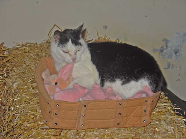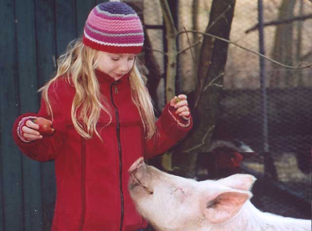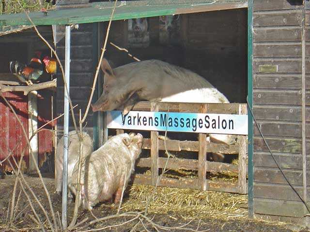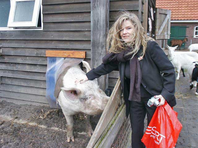 De Dag van de Heksenzalf ![]() De Heksenzalf werkt wel, maar leek wel zoutzuur bij het opbrengen. Kreeg nog goede raad per mail van een aardig iemand om er avocado op te doen. Lijkt me goed, klinkt heel zacht, maar in een dorp als Uithoorn niet wild voorradig. Dan maar door met de Heksenzalf. Een bruid vanmiddag met 14 vriendinnen, schoonmoeder en familie. Was echt aan ze besteed. Grote belangstelling voor de dieren en hun achtergrondverhalen. Leuk, want ze kwamen toch allemaal uit de omgeving van Emmeloord, Marknesse, en zo, dus zou je denken dat dit allemaal heel gewoon voor ze zou zijn. Nee dus. Vooral de oormerkenkwestie, daar hadden ze grote oren naar. Babybig als klap op de vuurpijl aan het eind van de middag naar binnen gebracht. Die racete weer als vanouds als een tornado van hoek naar hoek en stal alle harten. Ze is zo razendsnel dat ze met een videocamera nauwelijks te volgen is. Ben gevraagd om naast Robert Schoemacher ambassadrice van de Stichting Zwerfdieren Samos te worden. Vrees dat het niet gaat. Het kost veel tijd - heb ik niet - en hoe sympathiek ik hun stichting ook vind, ze kunnen beter iemand vragen die of niks met dieren te maken heeft - zoals Robert Schoemacher, die het voor eigen PR doeleinden gebruikt - of iemand die bekend is van de honden of poezen. Ik ben van de boerderijdieren en het lijkt me verwarrend als ik op een dierenmanifestatie in de stand van de Zwerfdieren sta. Waar zijn de varkentjes zal er dan terecht gevraagd worden. Moet ik nog eens goed over nadenken. Dansmarieke bleek vanmiddag hele vreemde poezenbabys te hebben. Vier compleet roze katjes met krulstaartjes... Ze lag er prinsheerlijk bij, dat wel. Zaterdag 19 februari 2005 De Dag van Maxima in Den Haag ![]() Vandaag de hele dag op pad geweest met Tjerk van Zorgvoordieren.nl naar de Haagse Kinderboerderijen. Zijn broer reed ons en ik voelde me net Maxima die op werkbezoek ging. Daartoe was ik inderdaad uitgenodigd door de Haagse politici tijdens een gemeenteraadsvergadering waar ik als varkensdeskundige was gevraagd mijn zegje te komen doen. De Haagse gemoederen zijn al sinds een paar jaar hoog opgelaaid. Een aantal bezoekers is het niet eens met het fokbeleid en andere zaken van de kinderboerderijen. Tjerk heeft daar een actiegroep voor opgericht. In maart vorig jaar had hij, de dierenbescherming, Stichting Konijnenbelangen, EDEV (een Dier Een Vriend) etc. en Het Beloofde Varkensland spreektijd tijdens de Gemeenteraad. Ik heb daar toen met model Aagje onder mijn arm, staande in de raadszaal opheldering aan de wethouder gevraagd waar de kinderen van Maxima - een van de Haagse varkens - gebleven waren en hoe hun castratiebeleid er uit ziet. TV West was kort daarvoor hier geweest omdat ik had aangeboden Maxima met haar Vijf Prinsen - het ging om 5 beertjes - op te nemen. De gemeente gaf er toen de voorkeur aan om alsnog deze biggen richting slacht te laten gaan... Ik kreeg van de wethouder dan ook geen antwoord op mijn vragen. Al met al werd het een enorme commotie met schreeuwende mensen op de tribune: "Waar zijn die biggen??? En waar is Greet??!!!!!" Greet was de lievelingskoe van vele buurtbewoners die ook plotseling was afgevoerd. Het liep hoog op. De vergadering werd geschorst. In novemer werd er opnieuw vergaderd en bij die gelegenheid werd ik toen gevraagd mijn licht eens over de Haagse varkens te laten schijnen. We hebben 7 kinderboerderijen bezocht. Een paar van de toen door mij voorgestelde verbeteringen zijn inderdaad al doorgevoerd. Een wroetplek in een stenen uitloop bijvoorbeeld, hoe klein ook maar het is altijd beter dan niks. Sommige varkens zitten er perfect bij. Veel wroetruimte buiten en gezelschap aan elkaar. Alle dieren zagen er goed uit. Soms te goed, zoals de hangbuikers, waarvan sommige echt te dik zijn. Alleen Maxima baart mij zorgen. Zij heeft een heel zwakke zwabberende achterhand, net of de achterkant er helemaal niet bijhoort. Dat krijg je dus van die extra ingefokte ribben. De hele balans is uit zo'n varkenslichaam verdwenen. Dat was vorig jaar al zo, maar dat is inmiddels behoorlijk verergerd. Ze loopt stram en het kost haar zichtbaar moeite. Maar wat echt niet goed is, is dat er heel zuinig wordt gedaan met de hoeveel stro waar de varkens op liggen. Dat is bij alle Haagse KB zo, maar in het geval van Maxima nog eens extra zunig. Het gevolg is dat ze op een ijskoude betonnen vloer ligt met die zwakke achterbenen. Als het rheuma of artrose o.i.d. is, waasr het erg op lijkt, dan is het in haar geval helemaal van levensbelang dat ze het goed warm heeft. Dus Den Haag, kom op geef die varkens en zeker Maxima bergen en bergen stro! Dit en nog meer komt er in mijn rapport te staan. In april ga ik dat tijdens de gemeenteraadsvergadering aanbieden. En Tjerk van der Veen is ijzersterk. Die blijft maar doorgaan. Lang niet iedereen vindt dat leuk. En voor hem is het ook niet leuk om alsmaar de kwaaie pier te moeten zijn. Maar hij geeft niet op en uiteindelijk zullen de dieren hem dankbaar zijn... Vrijdag 18 februari 2005 De Dag van De Brandwond ![]() Eergister stootte ik met een halfnaakte rug tegen de kachel toen ik met BabyBig in gevecht was. Een kwestie van een ultrakorte confrontatie. Au! Je schrikt, deinst terug en dat was het dan. Het gekke is dat het pas pijn gaat doen als je weer 'los' bent. Dat bleef zo en toen ik het aanraakte voelde het ribbelig. Bij toeval zag ik het veel later - ik was het al lang weer vergeten - in de spiegel. Jeetje Mina. Een enorm grote paarsrode vlek met blaren. Sommige waren al open. Zag er uit als een echte brandwond. Opgezocht op internet en ja hoor, tweedegraads dus. Vannacht slecht geslapen omdat het brandde als een gek. Naar de dokter gaan is ook weer zo'n gedoe, daar kom ik gewoon nooit. Ja jaren terug, toen ik duivenvoer in mijn oor gekregen had en dat er niet meer uitkreeg. Na een week is dat er toen met een enorme tang uitgehaald, erg pijnlijk. Ik ga er maar van uit dat deze brandwond vanzelf geneest. Iemand riep iets over Witch Hazel,