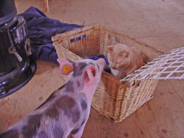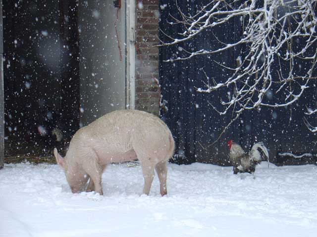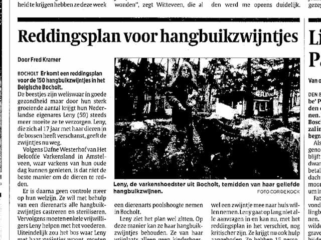De Dag van Golden Girl ![]() Golden Girl is vandaag ingeslapen. Vanmorgen lag ze dicht bij de kachel en kwam niet naar het gezamenlijk poezenontbijt van zachte brokjes. Ik wist het toen eigenlijk al. Heb nog wat foto's van haar gemaakt. Toen ik in Delft de kraam aan het opbouwen was, viel ze (haar replica dan) ineens om. Wie weet was dat het moment waarop ze haar laatste adem uitblies... En toen ik vanavond thuis kwam lag ze nog steeds bij de kachel, op haar andere zij. Dood. Ze heeft hier schitterende jaren gehad. Toen ik haar - negen jaar geleden - vrijkocht van de handelaar was ze al lang niet jong meer. Dus een oudje is ze wel geworden. Nu is Willempie zijn wijffie kwijt. Ik ben er wel treurig van. Zaterdag 5 maart 2005 De Dag van Broer ![]() Broer gaat de hoofdrol spelen in een filmpje. Dat zit zo: Tijdens de vogelpest was een Italiaans echtpaar op vakantie in Nederland. Ze hadden hun haan meegenomen. Die lieten ze aan een tuigje uit. Toen ze in IJmuiden met hem in een plantsoentje liepen werden ze overvallen door de politie. De haan werd meegenomen naar de dierenarts, die het diertje doodspoot. Dit verzin ik niet. Dit is echt gebeurd! Nu ben ik gevraagd door eens studente van de kunstacademie om mee te werken aan haar film. Ze wil die situatie in IJmuiden als verhaal nemen. Een man die een hechte band heeft met zijn haan etc. Ik ben daar erg enthousiast over want vond het destijds een schandalige streek van de mensen die de politie belden over die 'loslopende' haan. Broer komt in aanmerking. Een oudje, aanhankelijk, half blind door een gevecht van man tot man en broer van Stevie Wonder, die helemaal blind was en vorig jaar een poosje bij mij in huis woonde tot hij stierf. Ze vond alleen zijn naam al te gek dus haar film gaat Broer heten. Broer zit iedere dag trouw bij Zwartje als die in de voerzak haar ei legt. Hij blijft net zo lang zitten tot het karwei geklaard is. Volgende week hebben we een bespreking over het geheel. Het wordt vast een heel mooi filmpje. Over filmsterren gesproken... Maximiliaan heeft hier aanstaande dinsdag een screentest voor de Postbankreclame met die grote leeuw. Als we het eens worden dan worden de opnames gewoon hier gemaakt en wordt het zo getruct alsof hij naast de leeuw op straat loopt. Vanmiddag mijn presentatie over de oormerkenzaak bij de Nederlanse Vereniging voor Hobbyhouders. Was leuk om dat verhaal van begin tot eind te vertellen. Vooral het stukje radio interview met Gerard Spong maakt het hilarisch om die bekende stem in alle ernst over de Familie Bofkont te horen spreken. Op de terugweg werd ik gebeld of ik een interview wil geven aan 'Het Varkensbedrijf', een Belgisch vakblad voor varkensboeren. Maandag komt ze, dan kan het nog in het aprilnummer mee omdat ik 17 april een open middag organiseer voor Belgische varkensboeren. Dat allemaal nog vanwege mijn optreden op de landbouwbeurs vorige maand. Komt dat even goed uit. Zo langzamerhand begint Belgie een tweede podium te worden voor mijn varkens PR. Niet gek. Roodpels lijkt een heel klein beetje op te knappen... Vrijdag 4 maart 2005 De Dag van Roodpels ![]() Arme Roodpels, wat is hij ziek. Niesziekte en een ontsteking achter in z'n bekje. Eerst moet de niesziekte over zijn - kuur van 10 dagen - en dan pas kan de ontsteking aangepakt worden. De stoere jager uit de Bovenkerkerpolder is voor het eerst van zijn leven ziek en goed ook. Gelukkig eet hij nog goed en graag wat een wonder is met die neus vol snot. Moet ook want hij is zo mager geworden. Iedere keer als ik naar hem kijk denk ik dat ik Zachte Kees zie met z'n smalle snoetje. Heb hem zelfs al een paar keer per ongeluk zo genoemd. Maar ik heb goede hoop, Roodpels gaat het wel redden, dat weet ik zeker. Al is het alleen maar omdat ik zo dol op hem ben en hem niet wil missen... Toen hij weer terug was van de dokter sprong BabyBig enthousiast op hem af. Zij is zo gezond, vitaal en speels. Wat een biggie. Verder was het een feestmiddag. Met Vrouw Vos & Aagje de sneeuwpolder in. Varkens in de sneeuw. Wat een schitterend gezicht. En koeien in de sneeuw. Kom daar maar eens om. Brutale Griet en Vrouw Vos hebben nog staan matten. B.Griet maakte daarbij goed gebruik van haar hoorns, maar Vrouw Vos week geen strobreed en vocht dapper terug. Later zag ik dat ze toch een wondje bij haar slaap had van die hoorns. En dat is allemaal gefotografeerd, want Klaas Fopma was hier voor de Paroolreportage. Ik heb er al wat van teruggezien. Loop ik samen met Aagje door die enorme sneeuwvlakte. Gewoon van een andere wereld zo mooi. VTM Belgie belde, dat is de grootste televisiezender daar. Of ze volgende week opnames konden maken als ik bij de Bosheks ben. Collega's noemde ze ons. Klopt. Bosheks & Polderheks. Wat een giller. De burgemeester heeft ook al in de krant van alles geroepen over de Bosheks. Het wordt steeds leuker. Bosheks en ik bellen nu dagelijks over en weer om de laatste nieuwtjes uit te wisselen. Morgen staan we in de Telegraaf. Morgen ook de oormerkenlezing bij de Nederlandse Vereniging voor Hobbydierhouders. En zondag maakt de Familie Bofkont acte de presence op de Delfste Dierenopvangdag. Moet er al om 7.30 uur zijn om alles op te bouwen. Dan moet ik halverwege de middag geïnterviewd worden voor de Belgische Vegetariersbond en komt de journalist naar Delft toe omdat het anders niet meer in mijn agenda viel in te passen. Leven met en voor de Familie Bofkont en daarnaast de acties, never a dull moment... Donderdag 3 maart 2005 De Dag van AdopteerEenHangbuikzwijn.nl ![]() De actiesite www.AdopteerEenHangbuikzwijn.nl is in de lucht. De eerste donatietoezeggingen zijn binnen. De site wordt druk bezocht. Er stond een ijzige oostenwind. Het sprookje van gister is de Noordpool geworden. Nog steeds prachtig, maar grimmig. Ben keihard gevallen. Omdat je niks meer ziet dan alleen sneeuw weet je niet precies waar je loopt, vandaar. Vallen is iets mals. Je ondergaat dat het gebeurt, maar kunt niks ondernemen om het te voorkomen of tegen te houden. Veel we