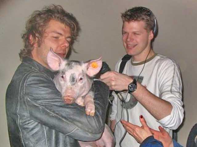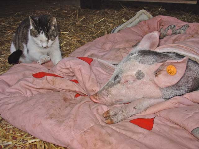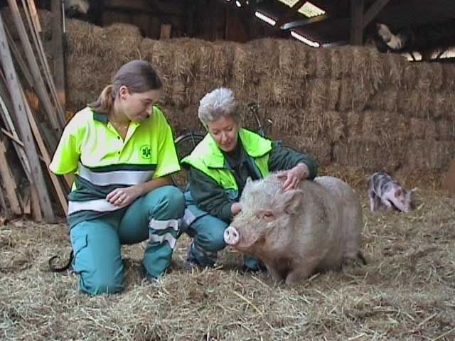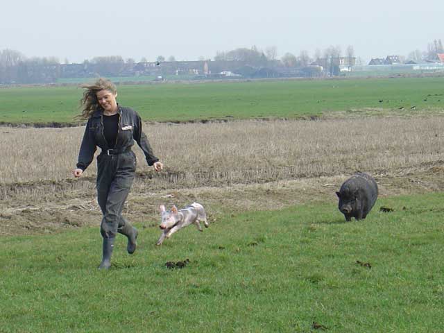De Dag van Boy George & BabyBig ![]() Eerste Paasdag Zomertijd. BabyBig liet zich niet foppen. Na haar vroege ontbijt ging ze nog lekker even liggen. Ik moest haar instoppen en Boy George hoefde zich dat ook geen twee keer te laten zeggen. Hij kroop er onmiddellijk bij en stampte er als een razende op los. Wat een prachtig erf met die opkomende zon en alle dieren aan het eten. Dat zijn de momenten waar het allemaal om draait. Van een eenvoud die z'n weerga niet kent. Maar niet te lang gedraald want ik moest flink aanpoten om de boel aan kant te hebben voor de workshop. BabyBig bleef maar liggen, ook al liep ik wel 100 keer door haar stal heen en weer om voer te halen, emmers, bezems etc. Anders schoot ze met het kleinste geluidje al onder haar stro vandaan om mee naar buiten te kunnen. Zou ze niet lekker zijn, dacht ik. Toen de mensen gearriveerd waren en ze zich nog steeds niet vertoonde - anders stond ze meteen met haar nieuwsgierige neus vooraan - had ik het antwoord. Natuurlijk! Die is bekaf van die worstelpartij met Arie Bombarie gister! Waarschijnlijk sterft ze van de spierpijn. Ik heb zelf ook ooit eens letterlijk voor mijn leven moeten vechten en was daarna volkomen kapot, gesloopt, kon niks meer bewegen. Dat kwam toen ook pas de volgende dag. En ja hoor, toen we bij Rosamunde & Brutale Griet met borstelen begonnen, kwam ze toch ineens tevoorschijn en liep inderdaad zo stram en stijf als een plank. De workshop was enig. Grote beroering omdat Miss Piggy het pasgelegde eitje van Witje zo uit uit het stro van haar leghoekje opat. De hanen en Witje hebben wel 10 minuten non stop geschreeuwd. Kon ik meteen vertellen over de legrituelen van een kip, die nog op een natuurlijke manier kan leven. BabyBig loopt voortdurend om Miss Piggy heen en probeert aan haar spenen te zuigen. Miss Piggy staat dan doodstil, tot het haar verveelt en dan krijgt BB een 'Take This'. Dat is goed want zo wordt ze toch nog een beetje door een ander varken opgevoed. Boy George stal vandaag de show. Tijdens de varkensmassage wandelde hij naar binnen en ging bovenop Aagje liggen stampen. Iedereen smolt. Fotocamera's flitsten af en aan. Er zijn prachtige opnames van. BG werd zo enthousiast van al die aandacht dat hij zijn nagels steeds verder uitstak. Dat werd Aagje te gortig. Ze kwam overeind en toen was het uit met de pret. Tijdens de borrel en het napraten kwam F. op afspraak langs, die eerder een workshop volgde en ook 'iets' wil gaan doen met voorlichting over dierenleed. Ze wil advies over hoe en wat. Baan opzeggen? Ander leven? Hoe dan? Wat dan? We hebben anderhalf uur gesproken. Ik heb haar uiteindelijk drie cruciale vragen gesteld. Daar kan ze voorlopig mee voort. Zaterdag 26 maart 2005 De Dag van Maximiliaan ![]() Heel vroeg hoorde ik plotseling een vreselijk gekrijs buiten. Ik stormde m'n bed uit en zag in de verte bij het toegangshek een enorm geworstel. BabyBig hing min of meer op haar kop klem tussen de spijlen en Arie Bombarie stond op haar in te hakken terwijl ze geen kant op kon. De andere varkens stormden toe, precies zoals ik altijd had gelezen. Het krijsen is om de rest te waarschuwen voor gevaar en om hulp te roepen. Ik was naakt en kon zo snel niks vinden, geen kleren en geen sleutel om de voordeur uit te kunnen. Stormde naar een andere uitgang, met een been half hinkend in een overall die ik onderweg gevonden had. Op blote voeten door het grind, ik voelde niks, terwijl dat normaal toch bepaald geen pretje is. Toen ik ter plekke aankwam had BabyBig zich net door de spijlen heen gewrongen - wat normaal ook onmogelijk is - en stond aan de verkeerde kant. Stormde gedesorienteerd het voorperceel op en toen ze me hoorde roepen wilde ze de sloot in springen om bij me te komen. Wat je noemt een consternatie van comme ca. Ik rende het weiland in en tilde haar op. Ze zat vol rode plekken door die gemene harde snavel van Arie B. Dacht dat ik haar staldeur toch goed vergrendeld had gisteravond, maar niet dus. Zag ook wat er gebeurd was. Iemand had gekookte aardappelschillen en een zak met oud brood voor het hek gelegd. Dat had ze natuurlijk geroken en haar kopje door het hek gestoken. Arie B. die aan de kant van het brood stond had zijn kans schoon gezien en haar gegrepen. Met radio Emmen wel een kwartier over Maximiliaan gepraat. Ze waren zo benieuwd hoe het nu met hem gaat. Begin december was ik er ook voor - zoals dat zo mooi heet in het noorden des lands - omdat ik toen door hem was aangevallen. Heerlijk weer, veel buiten geweest. Dierenambulance Amsterdam kwam langs om foto's te maken van Maximiliaan. Ze hadden hem naar Drenthe teruggebracht na zijn vreselijke avontuur op die bewuste nacht in Amsterdam, vorig jaar oktober. Met 6 man van de brandweer was het ze gelukt om hem de dierenambulance bus in te krijgen. Hij had gegild als 10 speenvarkens bij mekaar, zeiden ze. Het blijft nog steeds een onnvoorstelbare geschiedenis. Een van z'n redsters had een zeer specifiek luchtje op. Daar zal hij haar wel aan herkennen, dacht ik. En dat was ook zo. Hij lag helemaal verstopt onder het stro, maar toen ze bij hem knielde, kwam dat enorme stopcontact meteen tevoorschijn. Ik zag hem denken, he die ken ik. Daarna kwam Nova en haar cameraman Tjitske Jan om vast allerlei details te filmen voor het komende interview van 11 april. Ze hebben prachtige beelden gemaakt van BabyBig met Brutale Griet en Rosamunde, die haar met hun enorme tongen likten. Roodpels eet aarde uit de bloempotten. Ik meende dat al eerder gezien te hebben maar vandaag was het overduidelijk. Waarschijnlijk heeft hij behoefte aan mineralen? Bij de dierenwinkel wisten ze het niet. Ik heb in ieder geval vitaminedruppels voor hem gekocht en Channah, mijn poezenjournalist gevraagd wat het is. Zij heeft het weer in haar poezenexpertgroep gegooid. Ik wacht op antwoord. Wat wel een goed teken is dat hij z'n staart weer om zich heen krult. Vorige week deed die staart niet meer mee. Die hing gewoon slap en steil neer. Morgen zomertijd en een workshop. Vr
