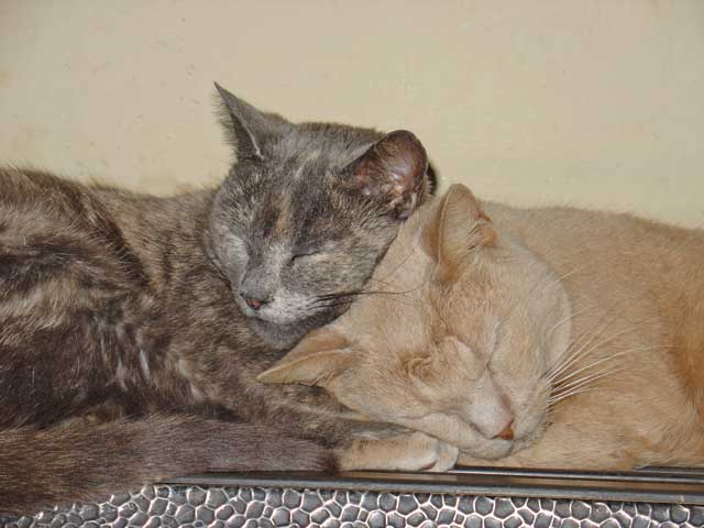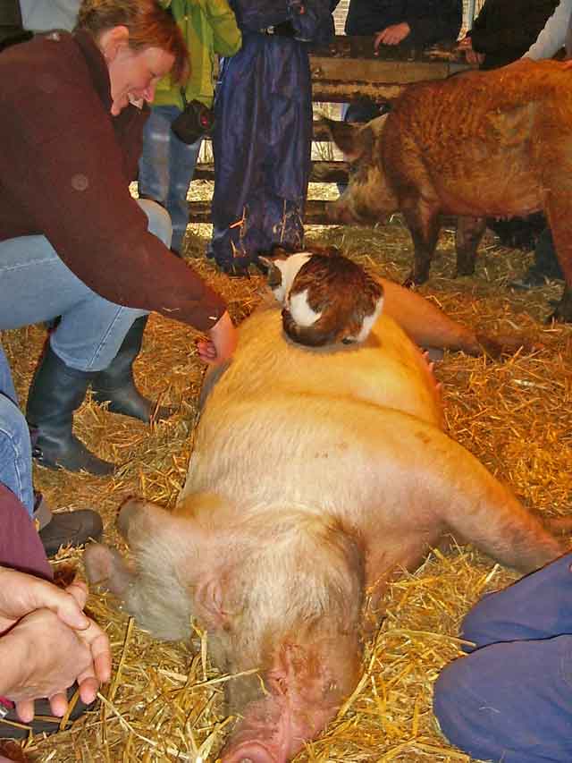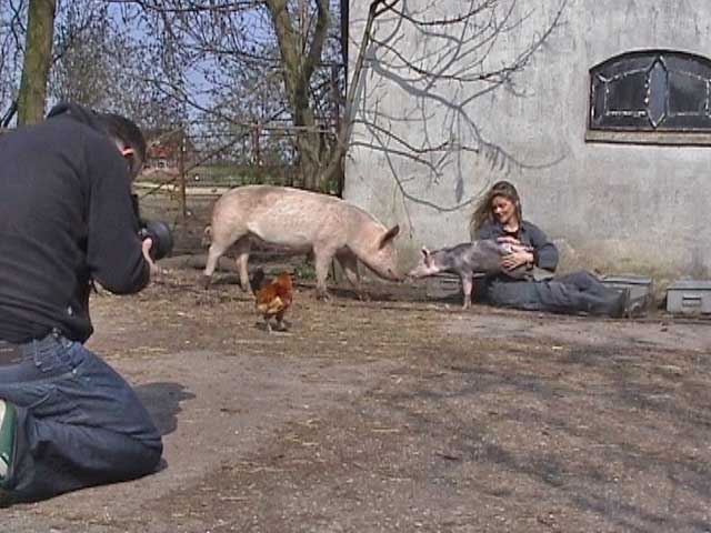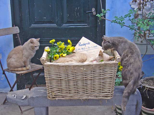 De Dag van De Begrafenis van Roodpels ![]() Wat zou het toch leuk zijn als Roodpels daar eeuwig in zijn mandje had kunnen blijven liggen. Maar helaas zo is het niet. Dat zou toch een rare stinkboel geworden zijn. En opgezette dieren vind ik vreemd. Dat zijn zulke gekke stijve poppen, daar zit letterlijk geen leven meer in. Laatst las ik van een poes die gekloond was voor een astronomisch bedrag. Vind ik ook mal. Er is maar een Roodpels en dat moet zo blijven. Maar ik snap het allemaal wel. Het zijn allemaal manieren om het afscheid uit te stellen of helemaal niet aan te gaan... Giel en zijn vrouw Marisa kwamen en werden verliefd. Ze waren er helemaal stil van, van de varkens. Toen ze bij Aagje lagen heb ik ze alleen gelaten. Ik had er alle vertrouwen in en er was geen sprake van dat Aagje het ineens op haar heupen zou krijgen bij deze rustige, aardige mensen. Ze komen terug, maar daarover later meer. Ja en toen was het zes uur. Ik had besloten dat Roodpels dan maar moest gaan. De andere poezen heb ik hun eten gegeven bij zijn mand, zodat ze daarna nog een poos bij hem konden zitten. Moeder Rode Poes zat naast hem op een stoeltje en de nieuwsgierige Spook heeft hem nog uitvoerig besnuffeld. Nu ligt ie onder de grond. Daar ligt ie goed. Naast Grijze Kat en Zachte Kees - zijn vader en broer - en naast Mollie, die meekwam uit Amsterdam, en naast Donker Dier en het Rode Snotaapje - twee zwervers - die hier beiden gestorven zijn aan een geheimzinnige ziekte. Nu weet ik dat dat bijna zeker ook aids was. De boerderij bestaat eigenlijk uit twee boerderijen. De grote boerderij en een klein boerderijtje er pal naast. In die kleine boerderij gingen de ouders wonen als hun oudste zoon het bedrijf overnam. Hij bleef dan met zijn jonge gezin in de grote boerderij. Tussen deze twee gebouwen ligt in alle beslotenheid de begraafplaats van de Familie Bofkont. Een mooi prive stukje waar nooit iemand komt, behalve ik. Daar liggen de poezen en een aantal lievelingsklppen. Er staan wat vlieren en er fluiten altijd vogeltjes. Ik heb er een verhoogd geheim zonneterras, waar je op komt via een houten trapje. Daar lig je helemaal vrij, niemand kan je daar ooit zien. terwijl er wel het uitzicht op de polder is. Onder dat verhoogde terrasje, dat tussen de twee gebouwen hangt, daar liggen ze. En daar ligt Roodpels nu ook bij. Vrijdag 1 april 2005 De Dag van Vadertje Grijze Kat ![]() Toeval bestaat niet. Loop ik vanochtend net aan de vader van Roodpels te denken, Grijze Kat, ook wel Koning Grijze Kat genaamd, komt er iemand langs, een buurman van verderop. Die heeft sinds kort een zwerver, afkomstig van de volkstuinen met een dikke grijze vacht. Wild als een tijger en vecht als een gek met zijn andere katten. Of ik iets of iemand wist die hem kon opnemen... We raakten aan de praat en al gauw kom ik er achter dat deze zwerver een zoon of kleinzoon moet zijn van de vader van Roodpels. Die kwam ook bij mij als zwerver aanlopen van datzelfde volkstuinencomplex bij mij aan de overkant. Het sterft daar van de katten, allemaal verwilderde, ongecastreerde vechtersbazen. Een broeinest dus voor aids. En dat fokt maar aan. De buurman had ook al de afgelopen jaren een paar van zijn eigen katten verloren aan een vreemde ziekte, die niet verklaarbaar leek. Aan alles te horen aids dus. Ik haalde meteen de Aids scriptie tevoorschijn. Hij had er nog nooit van gehoord dat katten aids konden krijgen. Niet alleen van vechten - bloedcontact dus - maar ook door elkaar te likken en gezamenlijke kattenbakken. Inmiddels ben ik razend nieuwsgierig naar die grijze kat van hem. Morgen ga ik kijken. Ik zie het meteen als het een nazaat is van Grijze Kat. In ieder geval moet hij gevangen en gecastreerd. Dan laat ik hem meteen onderzoeken op aids. Maar.....het plannetje dat ik jaren geleden al had om op die volkstuinen een Poezenhospitaaltje op te zetten en daar alle zwerfkaters te laten castreren en alle zwerfpoezen te steriliseren zit nu weer in mijn kop. Destijds liet ik het lopen vanwege tijdgebrek. Dat is op zich niks veranderd - integendeel - maar als het waar is dat het daar een aidshaard is, dan moet er wat gebeuren. Zo kan ik dan toch nog een positieve draai geven aan de dood van Roodpels. Hij heeft het ongetwijfeld daar vandaan. Regelmatig komen er hier zwerfkatten op het erf van de volkstuinen op zoek naar eten. Een aantal hebben hier ook tijden gewoond. Ik ga morgen eens poolshoogte nemen. Prachtig weer en tijd voor een grote erf-opruiming. Dat verzet de zinnen. Dus heb ik de hele dag heen en weer gereden naar het vuilstation met troep en afval. In de namiddag belde Giel Beelen op dat hij jaloers is op Coen en Sander van 3FM - Swijnenstal en Sandersjow, omdat die hier geweest zijn en hij nog niet. Afspraak gemaakt voor zondag. Komt ie met z'n vrouw Marisa. Leuk. Dat zijn ze al bijna een jaar van plan, maar nu gaat het dus ook gebeuren. En Roodpels ligt in de melkerij en is koud en stijf. En toch als je er langsloopt ligt ie gewoon even een dutje te doen... Donderdag 31 maart 2005 De Dag van de Roodpels Sessie ![]() Vandaag moest ik vrolijk doen want de fotograaf kwam langs om mij met een varken op de foto te zetten voor de Volkskrant. Dat was al afgesproken en vanwege de deadline moest dat dus gewoon doorgaan. Omdat ik toch bijna de hele nacht wakker lag, bedacht ik dat ik nu eigenlijk alleen maar met Roodpels op de foto wil. De opgebaarde Roodpels en zijn kattenfamilie er om heen. Dat zal vast wel niet mogen en bovendien zal de fotograaf erg schrikken van een dood beest, dacht ik. Maar nee. De fotograaf vond het zelfs een fantastisch idee. Hij vond Roodpels prachtig zoals hij er bij ligt en zag meteen een prachtige foto voor zich, die hoge, bijna statige melkerij en de dierenfamilie die afscheid neemt van een geliefd dier. Voor de zekerheid heb ik toch nog door de polder gedraafd met BabyBig op mijn hielen en zijn er nog meer foto's buiten bij de varkens gemaakt. Voor de Roodpels Sessie een extra afspraak gemaakt voor aanstaande zaterd