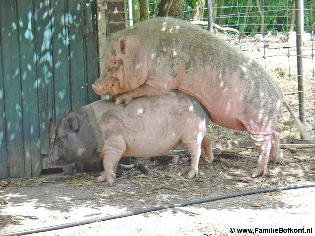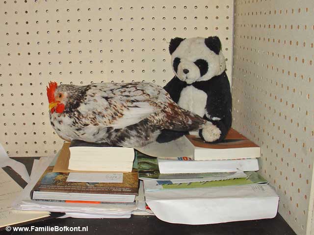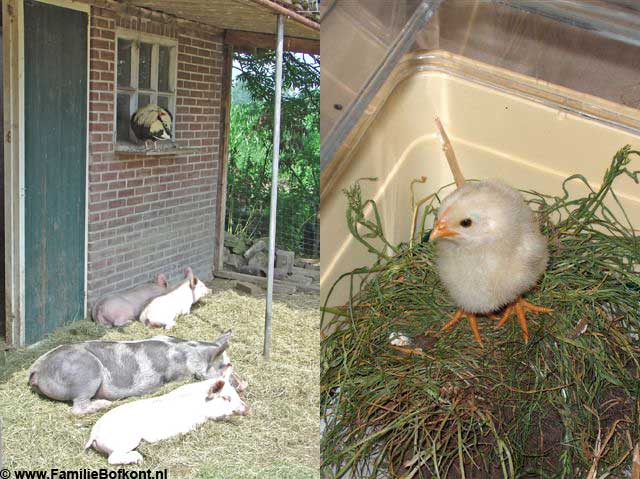 De Dag van The Lovers ![]() Het gaat een stuk beter met Theo. Hij wordt minder angstig en schuw. Durft nu zelfs een beetje naar voren te komen als ik zijn eten neerzet. Dan wacht hij wel met smakken tot ik weg ben, maar al met al maakt hij vorderingen. Ik was zelfs zo optimistisch dat ik E. heb gevraagd een stuk van de barricade weg te halen. Prompt ging Theo met zijn voorpoten tegen de nu lagere deur opstaan. BabyBig deed meteen hetzelfde, maar dan vanaf de andere kant. Als dat maar goed gaat, want hij blijft nog zeker 4 weken in staat om zichzelf van een aanstaand vaderschap te verzekeren... Wie dat niet meer kan, maar toch net deed of dat niet zo was, is Maximiliaan. Hij heeft vandaag langdurig bovenop Miss Universe gezeten. Nu is zij ook zo berig als ik weet niet wat (E. had al blauwe knieeen omdat ze hem voortdurend probeert te bijten), en het maakt haar niet uit met wie ze het doet al was het met een sprinkhaan. Dus zij stond zich zo ontzettend uit te sloven dat Maximiliaan daar geen verweer meer tegen had. Het is aandoenlijk die twee zo bezig te zien. Toen M. het eindelijk opgaf, gingen ze samen lekker brandnetels eten. Die had ik net met armen vol gesneden voor BabyBig vanwege haar huisarrest en haar drie gezelschapsheertjes. Wim is nog steeds aan de antibiotica en heeft er nu ook vitamine B pillen bij. Hij laat zich niet aanraken maar is verder ok in de omgang. Het is ook al weer langer dan een week geleden dat we met die avontuurlijke vangpartij bezig waren. Er komen zulke aardige reacties binnen vanwege Sneeuwvlokje. Mensen die zich oprecht zorgen maken hoe het nu verder moet, adviezen, een forum op de site van het Dagblad van het Noorden, een vrouw die had gehoord dat S. al doodgeschoten was, kortom allemaal ongeruste en boze mensen. Rode Poes wordt mager, als zij ook maar geen aids heeft, dacht ik ineens, net als haar zoon Roodpels. Die moet ik dus goed in de gaten houden. E. is hard bezig met Villa Varkensgeluk. Als het oude stro en hooi er straks helemaal uit is, kunnen we gaan schilderen en zal de nieuwe varkensmassagesalon nog voor de winter klaar zijn. Extra mankracht is ideaal. Vooral omdat het steeds drukker wordt, snap ik nu al niet meer hoe het ging voor E.'s komst. Morgenochtend al weer voor dag en dauw de Blije Beesten Bus inladen en naar Amsterdam. Heerlijk dat E. dan komt om de dieren te doen, dat scheelt een hoop stress en ik kan met een gerust hart "De Stad op z'n Kop' gaan zetten. Heb er zin in. Vrijdag 22 juli 2005 De Dag van Praten, Praten & nog eens Praten ![]() De godganse dag gepraat met journalisten. Over Sneeuwvlokje natuurlijk en over Toekomstmuziek. Begon om 8.00 uur en eindigde om ongeveer 17.00 uur. De een kwam, de ander vertrok en tussendoor een 'bestuursvergadering' van Stichting Familie Bofkont en heel even het erf op naar de dieren. De biggen worden al zo groot. Het zijn echte mannetjes geworden. Het is heerlijk om even bij ze te liggen. Ze storten zich bovenop me en we liggen dan als een grote kluwen bij mekaar. BabyBig is daar al bijna te sterk voor. Als zij zich dan even roert, dan heeft ze de hele bult een eindje verderop gewerkt en dat gaat bepaald niet zachtzinnig. Toen alles en iedereen weer weg was, naar de Stopera gereden om daar met D. te overleggen over zondag. De Familie Bofkont komt langs, las ik bij toeval in de Uitkrant. Maar Stichting Aap is er ook, Artis, Kids for Animals en nog veel meer organisaties. Omdat er regen is voorspeld voor zondag heb ik nog een plek onder een afdak kunnen regelen anders gaat m'n decor naar de Filistijnen. En dat wordt een prachtige plek, pal naast het podium en de hoofdingang. Bij thuiskomst vond ik een hele berg babyfoto's van Willum in de mailbox. Een cadeautje. Als piepklein geel kuikentje zat hij al op de schouders van Anja en Ronald zag ik, vandaar dat hij dat nog steeds doet. Ik blijf me over hem verbazen, heb natuurlijk ook nog nooit een 'mensenkuiken' meegemaakt. Tientallen kuikentjes groot zien worden, maar altijd onder de vleugels van hun eigen moeder. Van de week vertelde ik iets aan iemand waar hij bij zat. Om mijn verhaal luister bij te zetten begon ik even quasi te 'krijsen'. Heel kort maar. En wat gebeurde er? W. antwoordde onmiddellijk. Op exact dezelfde toon en volume. Verbijsterend. De vergelijking met de uil van Harry Potter is zo gek nog niet... Donderdag 21 juli 2005 De Dag van Sneeuwvlokje ![]() Eindelijk de brief van de minister gekregen. Antwoord is nee. Zij willen - in tegenstelling tot Staatsbosbeheer en Fauna Beheer Eenheid Veluwe - geen uitzondering maken voor Sneeuwvlokje. Dat zette meteen de toon voor deze dag. De Wereldomroep die ik vorige week ook al moest verplaatsen i.v.m. de dumpzwijntjes, was gepland voor vanmiddag. Maar ik voelde de bui al hangen. Dat zou geen rustige reportage gaan worden. En dat klopte. 3 x radio en 3 x kranten voor Sneeuwvlokje. Volgende week de Wereldomroep dan maar. 3 x is scheepsrecht. De S. stukken zijn op deze site te lezen. Bezwaar maken heeft geen zin meer in dit geval. Daar gaan weer weken mee verloren en dan is Sneeuwvlokje inmiddels zo oud, dat het te moeilijk wordt om het dier te laten wennen aan zijn/haar nieuwe familie, laat staan aan mensen. Alles kan natuurlijk, maar het is verre van ideaal. Dat komt omdat S. hier - net als alle andere dieren - vrij zou gaan leven, dus geen hokken en hekken, wel een veilig overdekt nachtonderkomen natuurlijk. Opsluiten in een hok - hoe groot ook - is voor mij geen optie, daar ben ik fel op tegen. Maar voor een zwijn dat niet meer te socialiseren zou zijn, de enige mogelijkheid. Niet doen dus. Radio Gelderland had een goede reportage, waarin zowel Fauna Beheer, de Provinvie en ik aan het woord kwamen. Zo jammer, want Fauna Beheer wilde juist wel voor S. een uitzondering maken, evenals Staatsbosbeheer. Of ik S. dan niet zou kunnen ontvoeren, opperde Radio 538, waarop ik natuurlijk nee zei. Als idee aantrekkelijk, maar het moet wel bij het idee blijven. Volkomen onuitvoerbaar. Binnen no time zou de