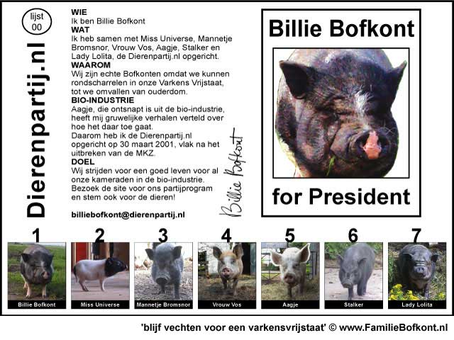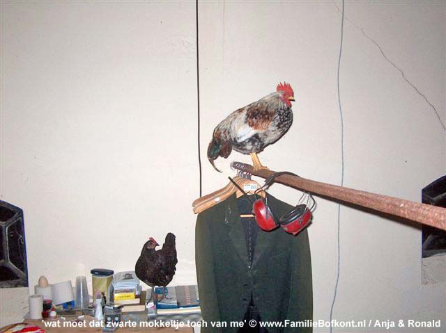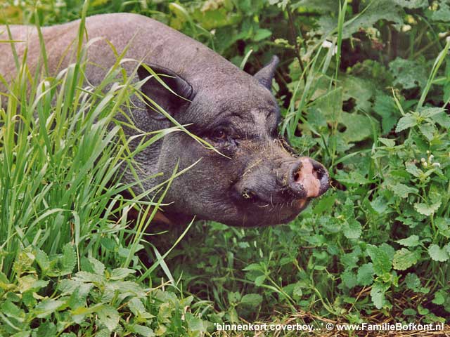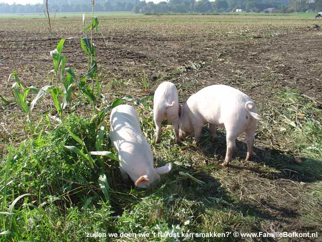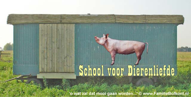De Dag van Bonestaakje ![]() Het heeft toch wel wat. In alle vroegte met je duffe hoofd weer een stand opbouwen. Altijd anders, ook al neem je dezelfde spullen mee. Maar de plek is bepalend. Deze keer een kraam, de BB Bus en een party tent. Regelmatig op evenementen opdraven geeft je het gevoel van een nomadenbestaan. Het werd mooi en druk. Veel leuke gesprekken gevoerd. De Familie Bofkont Soap werd intenstief bekeken. Naast ons stonden 2 geitjes en verderop de stier, de koe en haar kalf. Het was toch niet leuk. Ze zijn nooit op hun gemak, maar het was 1000 keer beter dan de laatste keer met die mobiele kinderboerderij. Halverwege moest ik al weer wegstormen want er kwam nog een stel psychiaters i.o. voor een workshop. Toen zij weg waren, gauw naar Bonestaakje, want die loopt mank sinds gister. Niks te vinden, wel een warm dikker pootje, dus dat zal waarschijnlijk verstuikt zijn. Ik hou ze voorlopig maar even binnen, dan kan hij goed uitrusten. Vrijdag 23 september 2005 De Dag van Swiebertje & De Daklozenkrant ![]() Fotoshoot voor de Daklozenkrant - Z Magazine. Billie Bofkont maakt grote kans coverboy te worden. Dat zou ik wel heel leuk vinden. Had er in het septembernummer al in gemoeten maar de journalist raakte z'n tekst kwijt, dus nu wordt het november. Gister veel Swiebertje gezien. Heb ooit nog een screentest met hem - Joop Doderer - gedaan. Volgens mij was dat voor Grijpstra & de Gier, of was dat toen nog niet. In ieder geval, ik lag verstopt onder een hotelbed, ik meen als dame van lichte zeden en hij viste me daar als inspecteur van politie onder vandaan. En dat alles ten burele van Hans Kemna. Die is trouwens geen spat veranderd zag ik op tv. En het voorval is meer dan 20 jaar gelden. Morgen naar de Streekmarkt. Donderdag 22 september 2005 De Dag van Vreugde & Leed ![]() Wat een feest. Alle dieren weer naar buiten. Ze stormden de kale akkers op. Op zoek naar achtergebleven maiskolven. Nou die liggen er voorlopig nog genoeg. De mannetjes ploften zowat uit elkaar. Het Arme Schaapje er achter aan. Het gaat heel goed met Het Arme Schaapje. Peter K. kwam eergister nog langs om naar hem te kijken en nog een ontwormingsinjectie te geven. Hij heeft zowaar vlees op de botten gekregen en is veel levendiger geworden. Daarna waren de billen van Aagje aan de beurt, Die rare rode pukkels is waarschijnlijk een kwestie van verstopte talgklieren. Dus toch een soort jeugdpuistjes. We gaan behandelen en kijken wat dat oplevert. P. dacht niet meteen aan huidkanker, waar ik wel aan gedacht had omdat er ook een soort zwarte moedervlekken bij zitten die snel groeien. Om dat te onderzoeken moet er een biopt genomen worden en daar moet ze voor onder narcose. Daar wil nog even over denken. Toen we daarna koffie gingen drinken zat het Toverhaantje de hele tijd voor het raampje naar binnen te kijken. Ik kon het niet meer aanzien en heb hem binnen gehaald. Een uurtje. Hij was weer helemaal in z'n element, wilde P. er van langs geven omdat die met mij zat te praten. Daarna heb ik hem toen weer teruggebracht naar zijn soortgenoten. Gister en vandaag zag ik dat hij zichzelf toch al wel een beetje bezig kan houden zonder dat ik er bij ben. Ik ben heel benieuwd hoe hij zich ontwikkelt. Een paar keer per dag ga ik even naar hem toe. Ik hoop zo dat het allemaal goed komt en anders moet ik voor de rest van m'n leven maar samenwonen met een haan. Hij kan het ook niet helpen dat hij opgegroeid is bij mensen en dus niet beter weet. We zien wel. Sneeuwwitje had weer een ratje te pakken. Een baby. Wat is dat toch altijd een drama. Ik ben eerst weggelopen, kon dat gepiep niet aanhoren. Toen weer terug, omdat dat natuurlijk ook de oplossing niet is. Weer weg. Weer terug. Toen ik het wilde afpakken, rende ze er mee weg. Maar op een gegeven moment had ik haar toch klem onder de legerambulance. Het ratje leefde nog steeds. Diep ademhalen en dapper zijn... Daarna het dode ratje weer teruggegeven. Ze at het met smaak op. Gelukkig maar. Heeft het nog zin gehad. Woensdag 21 september 2005 De Dag van Het Grote Figuurzagen ![]() Ik heb een figuurzager! Hij heet Ton, komt uit Heel (Limburg) en is vanmiddag op z'n motor aan komen scheuren om alles te bespreken. Een ongekende luxe: we hebben koffie gedronken en appeltaart gegeten. Buiten. En daar zit em nu net het bijzondere in. Alle dieren zaten binnen omdat het mais geoogst zou worden. Levengevaarlijk om ze los te laten lopen terwijl er zulk zwaar materieel het erf op komt stormen. Dus zij binnen en wij buiten. Het hele jaar eet en drink ik binnen, al vallen de mussen van het dak, maar als het mais geoogst wordt kan ik dat dus buiten doen. Wat een heerlijkheid. Niet omver gebulldozerd te worden, alles tegen de vlakte, maar gewoon heel relaxed te doen of het hele erf en weiland voor jou alleen is. De dieren alle vrijheid geven betekent dus dat je als mens veel, heel veel moet inleveren. Ik probeerde dat aan de Figuurzager uit te leggen, maar in eerste instantie begreep hij helemaal niet wat ik bedoelde. Toen ik uitlegde dat als we allebel rechtop in het gras zouden gaan staan met een bord appeltaart op ons hoofd, en dat ik dan van zijn bord en hij van het mijne zou eten, zag hij de siutatie voor zich. Zo is het gewoon. D. was er ook en we hebben doorgesproken wat de bedoeling is. Ton had zich spontaan aangemeld en aangeboden om 'iets' voor de Familie Bofkont te willen doen. Hij wist nog niet wat. Ik ook niet, tot hij een keer op een workshop kwam om kennis te maken. Ineens vroeg ik hem of hij niet wilde gaan figuurzagen. Woorden, de namen van de dieren, etc. Ik bleek op een knop gedrukt te hebben. Laat hij dat nou vroeger gedaan hebben, het ook nog verkocht te hebben, en hij had er al in geen 1000 jaar meer aan gedacht. Tot ik er over begon. Dus hij kwam met allerlei werkjes aanzetten, die hij vroeger voor zijn kinderen had gemaakt. Ook een biggetje met een petje op. Hartstikke leuk. Hij vroeg waarom ik er over begonnen was. Dat weet ik niet, zei ik. Ik ben een heks, zoiets. Instin