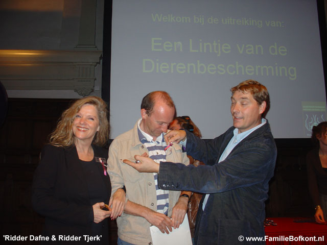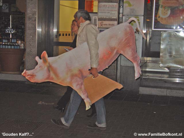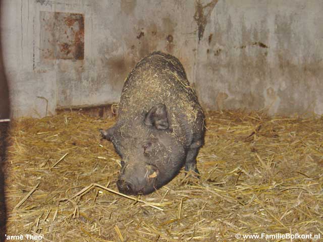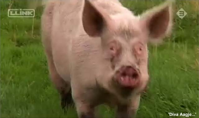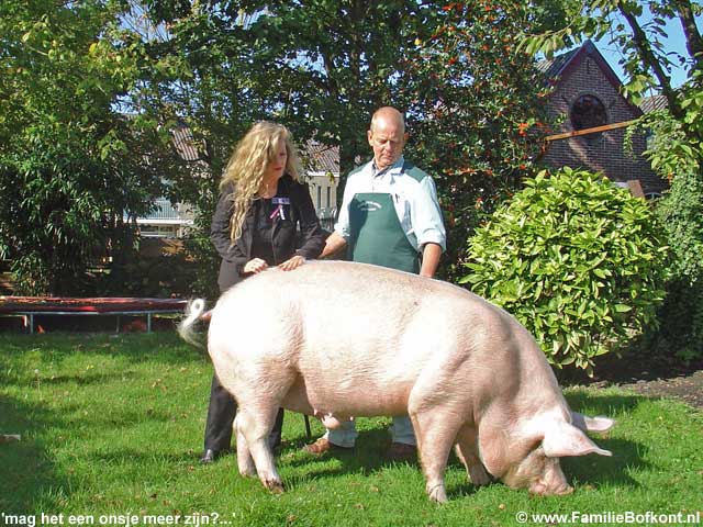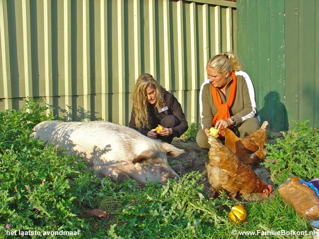 De Dag van Theo ![]() Drukke dag. Leuke dag. Verjaardagsfeest was bijzonder. Het Feestvarken was helemaal in zijn nopjes. Toen ze weg waren binnen een half uur alles weer teruggebracht in de uitgangspositie en daar kwam de nieuwe groep al aan. Leuke ontmoetingen. Er was een vrouw bij die ik van heeeel vroeger ken en zij ontmoette hier weer iemand die ze 15 jaar niet gezien had etc. Toen we heel ver op het land Rosamunde en Brutale Griet stonden te borstelen, zag ik in de verte dat Giel en Marisa bij Gieltje op het erf lagen met nog een paar vrienden en een kindje zo te zien. Ik heb ze niet meer gesproken, maar ik vermoed dat ze hun ogen niet konden geloven, zo groot als Gieltje inmiddels geworden is. Een verslaggeefster van Management Team was er ook bij en vond 't allemaal erg inspirerend vertelde ze na afloop. Leuk om weer eens geinterviewd te worden voor een businessblad. Weer eens wat anders dan alleen maar over de dieren. Miss Piggy is berig en heeft Theo letterlijk uit zijn tent gelokt. Die lag al een paar dagen binnen te mokken. Vermoedelijk een gevecht verloren van Maximiliaan. Maar op Miss Piggy kwam ie toch af. En nu is er iets heel geks gebeurd. Zijn kop staat scheef. Vermoedelijk omdat hij links en rechts wat liep te matten, is er kennelijk iets mis gegaan. Een whiplash, of zoiets, spier verrekt, zo ziet het er uit. Morgen moet er meteen hulp komen, want het ziet er heel pijnlijk voor hem uit. Zaterdag 8 oktober 2005 De Dag van Brutus ![]() Gister belde de slager van Het Onvoorstelbaar Grote Varken, Brutus. Hij had Het Beloofde Varkensland op tv gezien en was onder de indruk. Hij vroeg of ik zondag mee ga naar het strand samen met Brutus, maar ik kan helaas niet. Waarschijnlijk gaan we dan volgende week zondag, als het nog zulk mooi weer is. Af en toe gaat hij met Brutus wandelen aan het strand van Noordwijk aan Zee. Brutus graaft dan diepe kuilen waar hij zich vervolgens in laat ploffen. De Lintjesregen van de Dierenbescherming zag ik gister ook nog even voorbijkomen in het nieuwe programma van Robbie Muntz op LLink, de Milieuridders. Ik moest toen ook nog even wat op camera zeggen in de Rode Hoed. Ze hadden het heel close gedraaid, bijna een lachfilm. Ze vonden het ook belachelijk dat hele dierengedoe. Vanmiddag een bruid. Morgen een heel vol programma. 's Ochtends een Feestvarken met aanhang en 's middags een workshop met open inschrijvingen. Giel en Marisa komen ook. Die zullen wel opkijken hoe groot hun Gieltje inmiddel is! Donderdag 6 oktober 2005 De Dag van Aagje op LLink ![]() De Avro bleek het 'Lintjesfilmpje' van de Familie Bofkont op Dierendag uitgezonden te hebben op tv hoorde ik. En Aagje was vanavond op LLink te bewonderen. Dat zag er heel leuk uit. Een aria van Maria Callas onder de beelden en na afloop applaus. Mooi gemaakt! (kijk hier - start op 8 min.30 sec.) Het Arme Schaapje heb ik de hele dag binnen gehouden. Er hing een mist en al dat vocht leek me niet goed voor zijn longontsteking. Ton, de figuurzager, kwam uit Limburg over en heeft een begin gemaakt met het zagen van de houten letters voor De School voor Dierenliefde. Daarna heeft hij alles meegenomen in de trein en thuis gaat hij verder. Woensdag 5 oktober 2005 De Dag van Het Weesvarken uit Landsmeer ![]() Vandaag moest ik weer naar het varken in Landsmeer (zie 1 oktober). De begrafenis van de bewuste 'Swiebertje' was in Edam. Daarna zou iedereen in het cafe bij elkaar komen, en Peter Klaver en ik zouden naar het weesvarken gaan kijken. Marina had er inmiddels heel goed voor gezorgd. Ze had lekkere spullen gekocht en was doodop door de verantwoording die ze ineens op haar schouders genomen had. Zo voelde ze het. En zo is het ook. Op het moment dat je ja zegt tegen een dier, zit je er aan vast. Er is geen weg meer terug dan. De afgelopen dagen hadden we heen en weer gebeld hoe het ging en ik had er vertrouwen in dat ze het goed deed. Een hele consternatie werd het. De ontsteking aan zijn poot bleek zo groot als een meloen te zijn aan de binnenkant. We stonden er verbijsterd naar te kijken. Daarbij had hij een longontsteking. Na wat overleg over en weer was er maar een conclusie. Het arme dier moest inslapen. Dat gaf gedoe omdat de een na de ander het cafe uitkwam, snikkend, om te kijken hoe het nu verder moest. Het was ook onduidelijk van wie het varken nou precies was, sommigen claimden het, anderen distantieerden zich er van etc. Maar uiteindelijk waren we het eens. Het was zo'n mak en lief dier. Op een gegeven moment zocht ie zelf een plekje uit waar nog net een straaltje zon scheen. Daar ging hij liggen. Marina en ik hebben alle druiven, sinaasappels, appels en brood voor hem uitgestald. Hij heeft zich ongans gegeten. Op dat moment heeft Peter hem z'n eerst verdovingsshot gegeven. Het duurde een poos voor hij zich gewonnen gaf. Het eten smaakte hem nog zo goed. Hij is rustig ingeslapen. We hebben hem op een steekkarretje gehesen. Toen hij daar lag begonnen de klokken te luiden van de kerk naast het weilandje. Zo stemmig en mooi. Als het een film geweest was, zou het overdreven toevallig geweest zijn. Peter is nog mee gegaan naar huis samen met zijn assistente Frederie en D. Het Arme Schaapje is ziek en heeft een zeer moeilijke ademhaling. En dat bleek ook. 40 graden koorts. Longontsteking. Wat ben ik blij dat hij hier is gebleven. Daar wil je toch geen andere mensen mee opzadelen. Nu moeten we zelf aan de slag met antibioticum geven. Na de behandeling hebben we hier gegeten. Het was me het dagje weer wel. Dinsdag 4 oktober 2005 De Dag van de Dieren ![]() Onverwacht heel druk geworden. Veel radio-interviews tussen de bedrijven door, BNN United, Radio 3 FM, Radio - NoordHolland, allemaal hebben ze ruim aandacht besteed aan dierendag. Vanochtend al vroeg naar een slager in Zuid-Holland, die een varken aan het vetmesten is. Kist appels gebracht. Gevraagd of ik zijn varken mag kopen. Hij zei nog geen ja, maar ook niet nee. Volgende week maandag komt hij bij mij en gaan we verder praten. Een ongelooflij