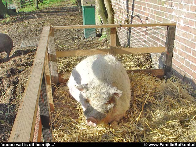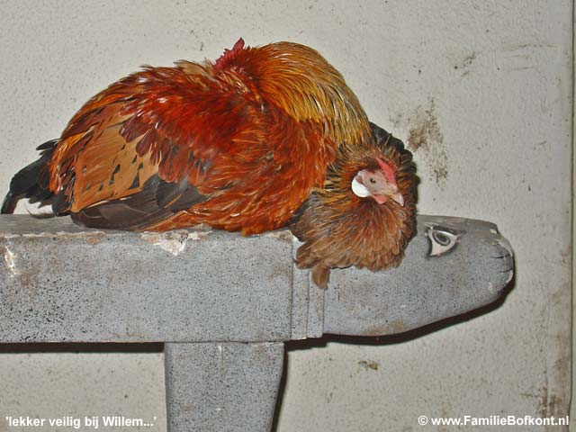 De Dag van De Zanger ![]() Heerlijk weer, zo zacht en zonder wind, dat De Zanger weer eens lekker op zijn waranda kon gaan liggen. De laatste week had ik het luik dichtgelaten, want er stond een gemene wind op. Maar vandaag kon het weer. Een feest om te zien hoe dat opaatje nog genieten kan op z'n oude dag. Hij ligt daar lekker beschermd tegen Arie Bombarie. Die rotzak stak z'n kop door de spijlen van het hekje en beet hem dan keihard. De arme blinde Zanger, schrok zich ongelukkig en durfde niet meer naar buiten te gaan. Maar nu is er rondom gaas gespannen en ligt hij er lekker veilig. Wie weet maakt hij de volgende zomer nog mee... Vrijdag 11 november 2005 De Dag Van De Weduwnaar ![]() Arme Willempie, nu is hij alweer weduwnaar voor de zoveelste keer. Minnie is overleden. Niks geleden, zomaar ineens lag ze dood. Een prachtige dood, zo zou je het ieder dier (en mens) toewensen. Maar voor Willem is het niet leuk. Dat malle haantje - de allerallereerste bewoner van de boerderij (naast Stinkwijfje, Mollie & Booswicht dan, maar die kwamen mee uit de stad) heeft al menig vrouwtje overleefd. Golden Girl, Groentje, Witje, Bruintje, Zwartje en nu dan Minnie. Het gekke is dat ik iedere keer denk dat Willempie het niet lang meer maakt, dat duurt nu al zo'n paar jaar en de laatste maand dacht ik dat het nu wel snel afgelopen zou zijn met hem, maar nee dus. Minnie en hij hadden een innig huwelijk. Zij werd hier zo'n drie jaar geleden door een Rotterdams echtpaar gebracht, omdat ze voortdurend op haar kop gezeten werd door andere dieren. Een klein bruin krielkipje, schattig beestje, maar o zo schuw. Dat is ze altijd gebleven, van iedere beweging schrok ze zich dood. Er werd om haar gunsten gevochten door Willem en zijn zoon Scheefbekje. Een poosje geleden heb ik de twee oudjes een eigen aanleunwoning gegeven. Ze wilden toch al heel lang niet meer naar buiten, dus kregen ze 'de mooie kamer' van de boerderij, waar vroeger de boer en zijn familie koffie dronken op zondag. En daar zaten ze heerlijk een beetje te soezen in de zon die door de glas in lood ramen van de erker naar binnen scheen. Iedere dag was ik benieuwd of Willem er nog was. Nooit gedacht dat Minnie eerder zou gaan. Nu heeft Willem gezelschap van Manke Nelis, een half verlamd haantje, dat nog geniet van het leven als hij maar niet op z'n kop gezeten wordt. Donderdag 10 november 2005 De Dag van De Gevallen Vrouw ![]() Ik was vandaag jarig en ik wilde mezelf trakteren op een wandeling door de polder. Dus ik trok er op uit. Het regende en dat maakte het alleen maar leuker, want ik hou van lopen in de regen. Brammetje & Gieltje renden achter me aan. Toen we een heel eind weg waren begonnen ze een beetje te jammeren. Ik denk dat ze heimwee kregen. Dus ik draaide me om en liep een eindje terug. Ze sprongen letterlijk een meter in de lucht van bijdschap en renden als idioten richting boerderij. Ik er achter aan en probeerde wat foto's te maken. Het volgende moment lag ik plat op de bek. hahaha. De camera lag eerst en daar bonsde ik met een doodklap met mijn voorhoofd boven op. Lens onder het water, dag mooi foto's, misschien zelfs dag camera. Vallen is merkwaardig. Zo sta je, zo lig je. En je kunt er niks tegen doen. |