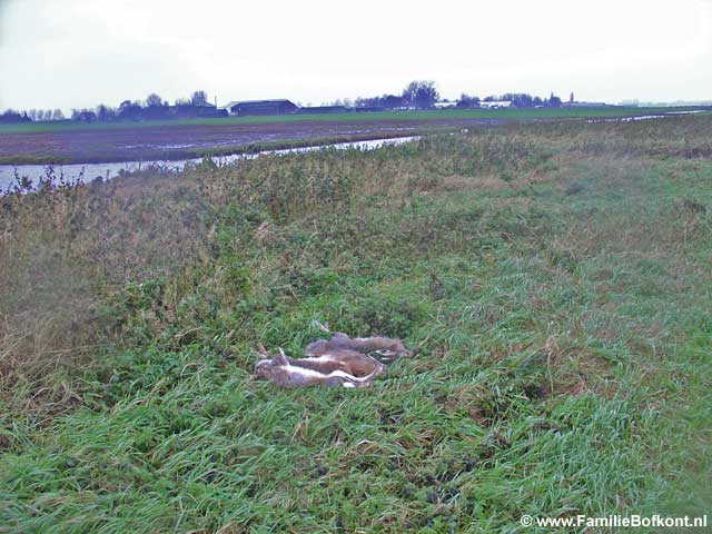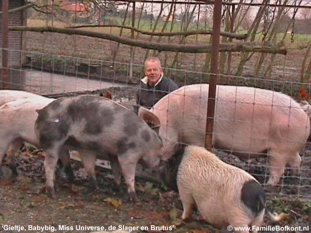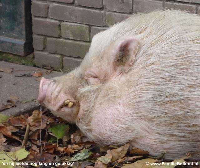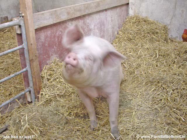 De Dag van Hoera Maximiliaan Een Jaar Bij Ons ![]() Vandaag, precies een jaar geleden kwam Maximiliaan bij de Familie Bofkont wonen. Toen brak ie de tent nog af van frustratie. En moet je nu eens kijken. Wat is die hersteld. Bij de workshop werd er ook meteen naar hem gevraagd, zoals altijd trouwens. Hij is erg populair. Een verrassing vanmiddag. Toen ik over de hanen uit het Amstelpark begon, en dat ik de laatste 150 niet meer herplaatst krijg, opperde een deelnemer dat hij wel plek had voor zo'n 100 hanen. Ik wist niet wat ik hoorde. Die man schijnt een gigantisch terrein te hebben met bos, wel zo'n 65 hectare. Binnenkort ga ik kijken. De slager belde. Hij wilde Brutus komen bezoeken. Ze zullen hem wel missen, dat kan niet anders. Afgesproken dat hij morgenmiddag langskomt. Zaterdag 3 december 2005 De Dag van De Arme Hazen ![]() Heel gek. Gister kwamen we tijdens de polderwandeling minstens 4 hazen tegen, die vlak voor onze voeten wegrenden. Niks gezien, tot dat je er bijna op staat. Wat een schutkleur. Prachtige dieren, zo snel en wendzaam. Daar ga ik vandaag iets over schrijven voor de weblog, dacht ik vanochtend. Toen ik vanmiddag de polder weer inliep, zag ik in de verte een groepje jagers struinen. Even later zag ik ze liggen, de vier prachtige hazen. De jagers hadden ze in het gras gelegd en gingen al weer verder. Ze liepen verspreid op een lijn en kamden zo de polder uit, op zoek naar nog meer hazen. Er was ook een klein ventje bij. Ik maakte rechtsomkeert. Toen zag ik ineens stokjes met knaloranje vlaggetjes eraan in de waterkant gestoken... Dat bleken vallen te zijn. Voor wie of wat? Ratten? In een van de vallen lag een dood dier. Ik zag alleen het bontjasje. Toen ik het omhoog haalde bleek het een marter (?) te zijn. Ik ben er naar van. Vrijdag 2 december 2005 De Dagen van Rep & Roer ![]() Wat een commotie rondom de nieuwkomer. Alles en iedereen loopt met rode schrammen en striemen rond. Er wordt wat afgekift door het hek van Brutus heen. Hij heeft allemaal beschadigingen rondom zijn bek. Gisterochtend heb ik hem zijn eerste massage gegeven. Hij genoot er met volle teugen van. Het is hard werken geblazen met deze reus. Wat een kolossaal lichaam lag daar in het stro. Aagje is op het hysterische af. Hoewel ze nog niet eens in de buurt van Brutus is geweest, merkt ze toch de onrust van de anderen. Daarbij komt dat ze berig is - en dermate geagiteerd en wild - dat ik gister niet met de groep bij haar naar binnen kon. Niet vertrouwd. Vanochtend ben ik voor het eerst niet bij haar naar binnen gegaan. Dat is me nog nooit gebeurd. Nou was ik ook niet alleen. Ik had in de kou een brainstorm wandeling met een client gemaakt in de polder. Na afloop deden we een rondje dieren. Aagje stormde als een ongeleid projectiel op ons af, stuiterde bijna over haar hek heen en stond met rollende ogen te grommen. Linke soep. Berige zeugen, laat ze met rust. Het gaat vanzelf wel weer over. Maar ze is niet de enige die van slag is. Ze zijn het allemaal. Brutus blijkt toch behoorlijk van zich af te bijten. Arme Bonestaakje. Hij had zijn snoetje door het hek heengestoken. Brutus nam zijn hele neus in zijn bek voor hij beet. Au! Helemaal beduusd is hij meteen vetrokken en verderop onder het stro gaan liggen. De bovenkant van zijn wroetschijf is behoorliijk geraakt, dat is juist het gevoeligste deel. En Miss Universe snauwt iedereen weg en van zich af. Kortom, hoop gedoe bij de Familie Bofkont. Maar het komt allemaal wel weer goed. Hoewel ik m'n hart vasthoud voor de dag dat Brutus de wijde wereld ingaat... Woensdag 30 november 2005 De Dag van Brutus Is Here ![]() Zoals Brutus afgelopen zondag onder luid applaus en gejoel de show stal met z'n modderbadfinale, zo narrig en knorrig was hij vanmiddag tijdens de wandeling met de kinderen. Verdomd, alsof ie het doorhad, dat het vandaag anders dan anders was. Tuurlijk was dat ook zo. Radio & TV liepen ook mee en dat gaf ook onrust omdat Gerard voortdurend zijn aandacht tussen de camera's en Brutus moest verdelen. Na afloop van het rondje dorp verdomde Brutus 't de trailer in te gaan. Dat leek nog een hele toestand te worden want de crew van Catherine Keyl zou hem om 15.00 uur bij Het Beloofde Varkensland opwachten. Godzijdank lukte het toch nog vrij snel. zodat we nog ruim op tijd terug waren. Ik reed voorop met het varken op de motorkap, daarna Gerard in zijn bus met allerlei Brutus-fans, in de trailer Brutus en daarna nog een aantal volgauto's. Een mal moment toen we langs het slachthuis van Kamerik reden, waar Brutus deze week geslacht had zullen worden. In een van die volgauto's zat o.a. de varkensboer die anderhalf jaar geleden Brutus als big aan Gerard had verkocht. Nou, die heeft hier zijn ogen uit gekeken. Gerard dacht zo even met Brutus het erf op te lopen vanaf de dijk. Hahaha, Dennis en Erik zijn gister de hele dag en avond bezig geweest om een paleis voor hem te maken, om zijn veiligheid en dat van alle andere varkens te garanderen. Als directe nachtburen heeft hij nu Theo, BabyBig en Miss Piggy, een lekkere stal met bergen stro en een riante uitloop naar buiten. Maar voorlopig blijft hij daar zeker een week of wat wonen. Enorme opwinding op het erf. Klappertandende varkens rondom de reus door het gaas heen. Schuimbekkend, niks ontzag voor zijn omvang, Miss Universe was hem zo te lijf gegaan als er geen gaas geweest was. De slager maakte nog een showtje voor de camera's door hem een appel uit zijn mond te laten eten. Ter afscheid overhandigde Gerard mij een mooi rood bord met de naam Brutus erop. Dat had hij laten maken. Maandag wil hij hem al komen opzoeken, en dan wil Man Bijt Hond meekomen. Maar dat zal er wel niet van komen want Omroep Max wil als eerste met Brutus scoren. Woensdag 7 december zal dat plaatsvinden, om Hennie Huisman - ook een varkensgek - te verrassen. |