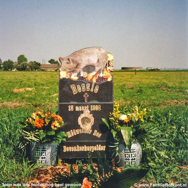 Wat het geweest is, misschien een maagverdraaiing door wild spelen? Ik zal het nooit weten. Bessie is maar 6 maanden geworden. Afkomstig uit het Midwolder Bos (Groningen) als dumpbiggetje.