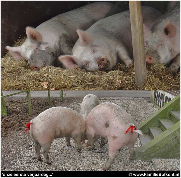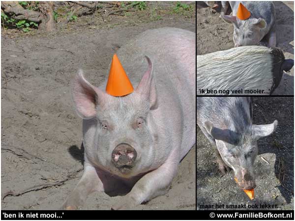 Nu komen ze straks hier met de lunch en daarna gaan we de varkens masseren. Hoop dat het wat lekkerder weer wordt. Gister was het zo koud. Heel eventjes scheen de zon, toen ben ik snel met de feesthoedjes naar buiten gegaan.