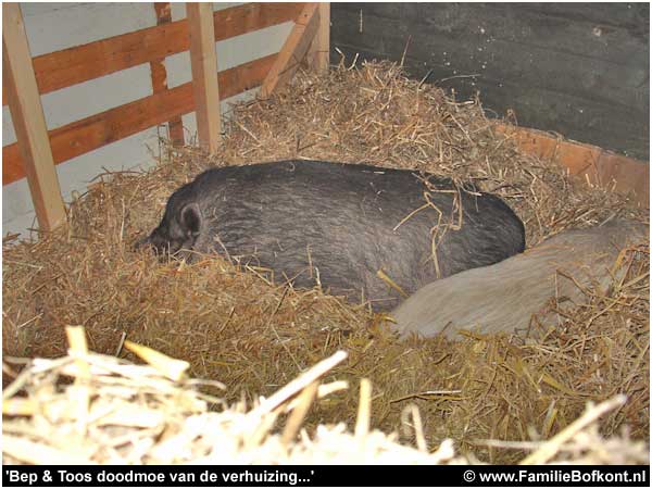 De twee gedumpte hangbuikzwijnjes (afgelopen januari) hebben een paar maanden op Het Beloofde Varkensland gewoond.