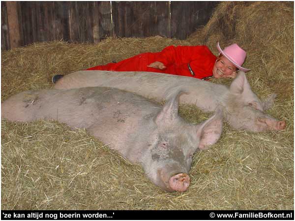 Ze waren niet meer weg te slaan bij de dieren. Iedere keer was het tijd om op te stappen. Maar dan zagen ze weer een nieuwe plek met varkens en hup daar lag het hele gezelschap weer tussen ze in.