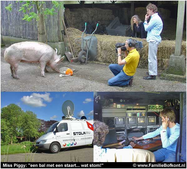 RTL 4 Editie NL belde er gister over. Wat ik er als erkende Varkensfluisteraar & Varkensmasseur (hahaha) van vond en of ze langs mochten komen voor een test. Ze gingen eerst naar een dierenspeciaalzaak om spullen te kopen. Met zakken vol hondenspeeltjes kwamen ze hier in een satellietauto aan. Dat stond wel heel stoer op de dijk. Alsof het de President van Amerika betrof (Hoewel, Billie Bofkont for President...).