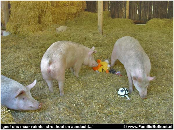 Als een dolle rent hij heen en weer, slipt uit de bocht, draait rondjes, scheurt kranten - en mijn post - aan flarden om vervolgens doodop bij de kachel neer te ploffen voor een dutje. Dit kleine opdondertje heeft binnen een vloeroppervlak van ongeveer 350 vierkante meter tot zijn beschikking en dat 'gebuikt' hij ook allemaal. Hij gaat echt op onderzoek uit. Ieder hoekje en gaatje wordt geinspecteerd. Als je dus nagaat dat de biggen in de bio-industrie nauwelijks 1 vierkante meter per big hebben, dan is het logisch dat ze zich doodvervelen...