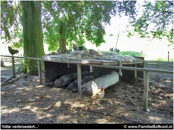 Alle dieren van Het Beloofde Varkensland zoeken verkoeling in de schaduw.