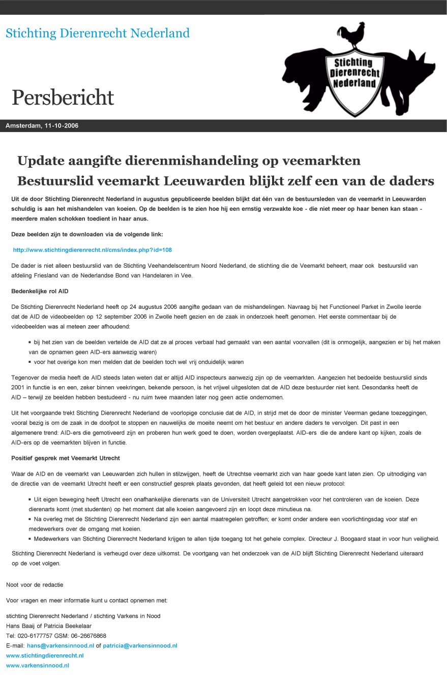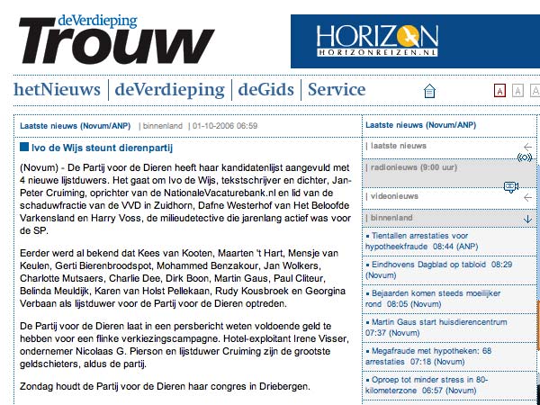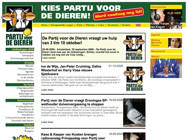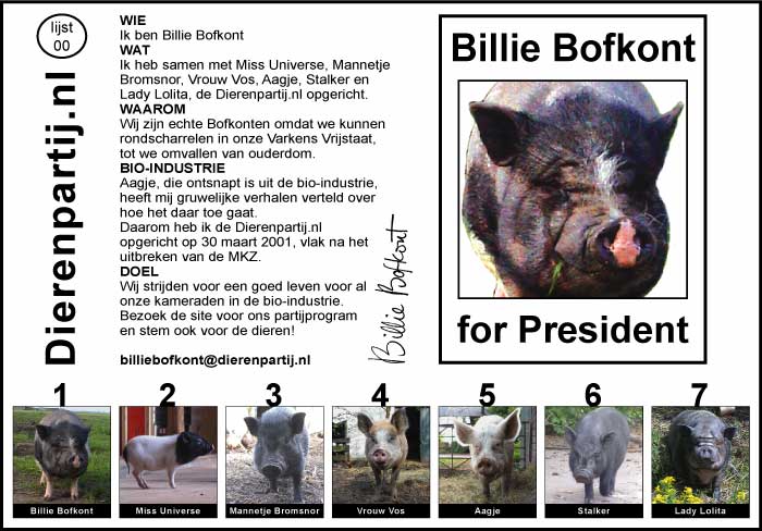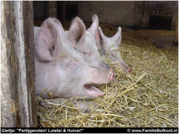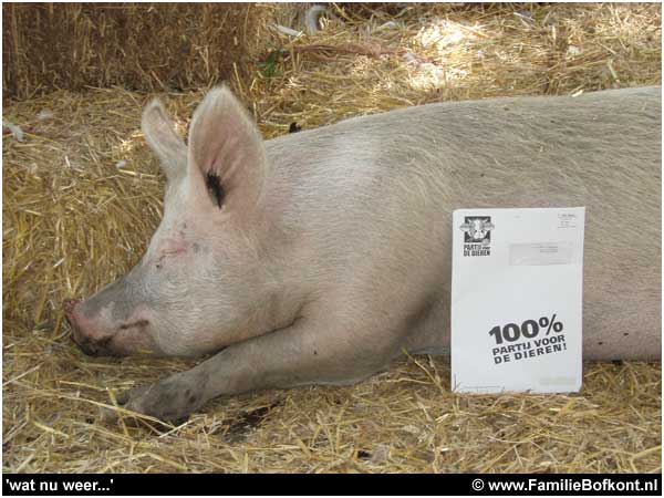 Op 22 november zijn er weer verkiezingen. De zwevende kiezer die varkens opeet en zegt van dieren te houden, wordt nu op z'n wenken bediend. Wat dacht u van de Partij voor de Dieren? Die willen ook alle varkens op stro. Doet u dat nou eens, opkomen voor de dieren. De PvdD moet hoe dan ook de kamer in. Laat ze daar de boel maar eens goed op stelten gaan zetten. Vindt u ook niet dat we dat aan de varkens en alle andere consumptiedieren verschuldigd zijn? Dan ziet u over 4 jaar maar weer verder. Maar eerst moet die partij de kamer in.
