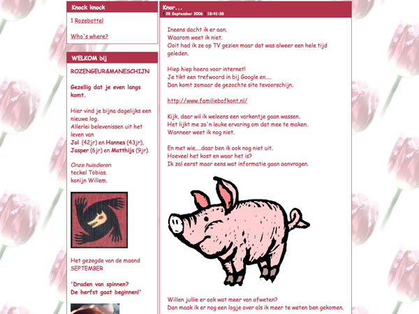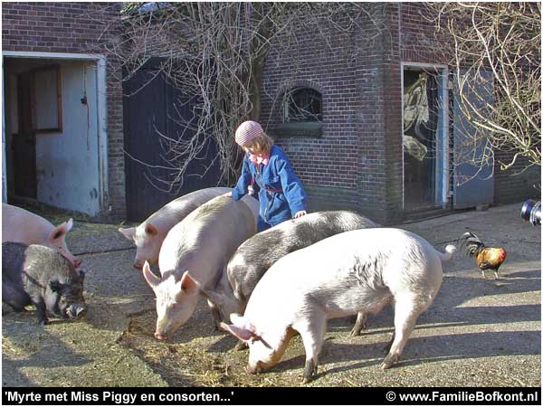 Myrte begon een paar jaar geleden met Miss Piggy te mailen (toen zij nog een big was) en van het een kwam het ander. Vader Tjerk ronselde zijn collega's voor stoeremannenklussen op Het Beloofde Varkensland, zus Laura nam haar giechelvriendin mee inclusief de hele familie voor een TV opname, moeder Sylvia zorgde voor de catering, Lasse zijn juf vierde hier haar vrijgezellenfeestje, en Myrte werd beroemd door haar interview in Kek.