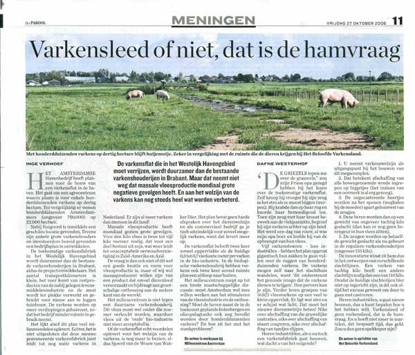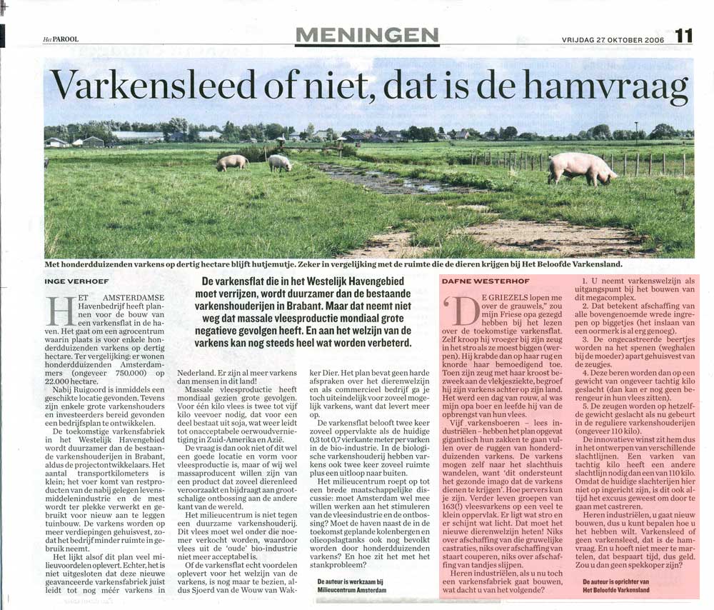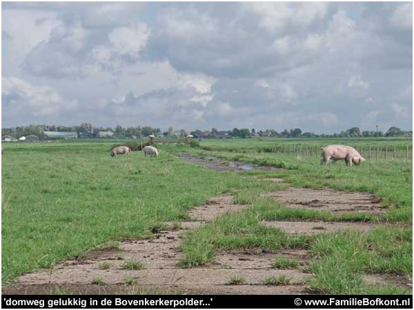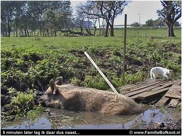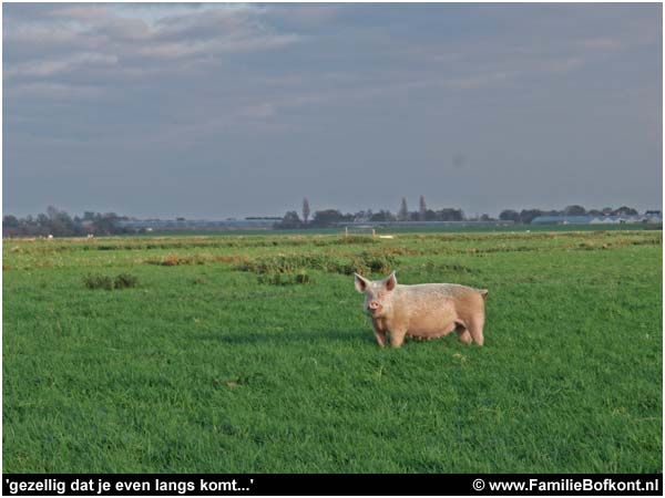 Toen ik eindelijk - na een stief kwartiertje - bij Aagje aankwam, stond ze te wroeten of haar leven er van afhing. Haar neus was helemaal nat blank en schoon van het hoge natte gras. 'Gezellig dat je even aankomt' zag je haar denken en we hebben samen een stukje opgelopen. Daarna ben ik weer gegaan en zij bleef lekker waar ze was. Krankzinnig gezicht. Aagje en Brammetje. Twee varkens op een stuk polder van 20 hectare. In Amsterdam wordt aan een varkensfabriek gedacht op een terrein van ook 20 hectare. Maar daar komen dan wel 500.000 varkens in...