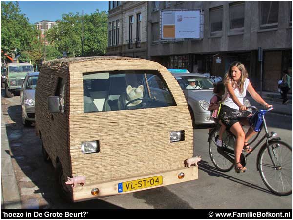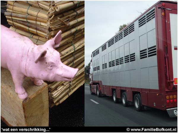 Gister naar de opening van een biologische kalverhouderij geweest. Onderweg passeerde ik een vrachtwagen vol varkens. Ik zal daar nooit aan wennen. Moet een krankjorum gezicht geweest zijn, mijn kleine rietbusje met de varkentjes op de houten bumpers naast die monsterachtige wagen vol varkensverdriet. De kalfjes hadden het gelukkig een stuk beter. Ze leven in groepen en kunnen ook heel vaak naar buiten. Later meer over deze kalverhouderij.