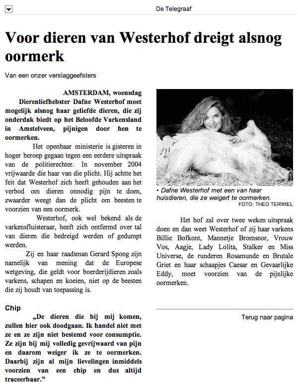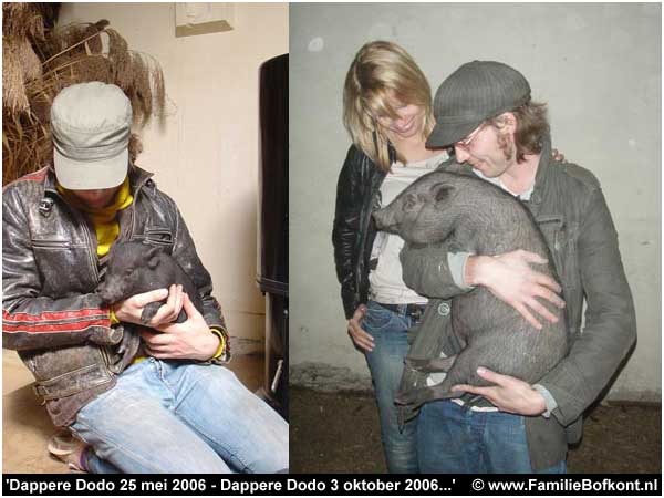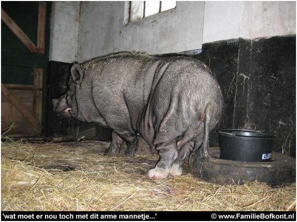 Ik zit verschrikkelijk in m'n maag met een heel tragisch hangbuikzwijntje. Het beestje woonde bij iemand in een kist, met rondom 10 cm ruimte en stond midden in z'n eigen drollen. Een meisje had medelijden met hem en heeft hem naar een ander adres laten brengen. Daar wonen al twee vrouwtjes hangbuikzwijnen. Die ging hij bijten en daarom werd er gezegd dat hij ongecastreerd is en vals. Toen is hij voor straf opgesloten in een kraakpand, ik heb foto's gezien, zo erg. Een enorme troep, allemaal gebroken glas op de grond etc. Hij schijnt opgejaagd en geslagen te worden met een stok.