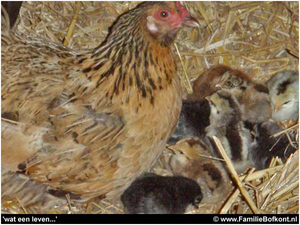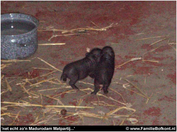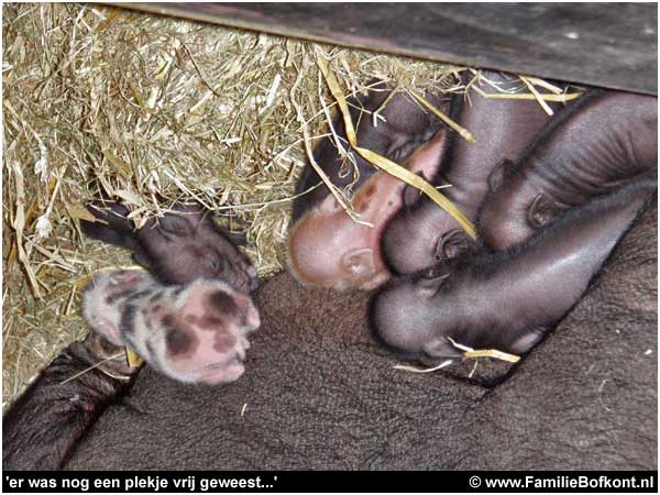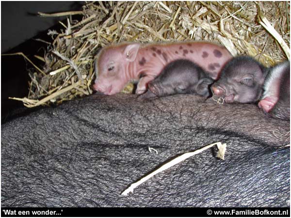 Bij thuiskomst meteen bij Moeke en haar kleintjes gaan kijken. Ze beginnen al wat rond te scharrelen op hun wankele pootjes. En ze komen naar me toe als Moeke dat goed vindt. En dat heeft ze al twee keer goed gevonden. Ik hoor aan haar geluiden wanneer dat is. Wat een wonder dat die kleintjes naar me toe komen als ze horen dat het goed is. Wat een vertrouwen. Wat had ik graag dat roze consumptiebiggetje tussen ze in gelegd. Het had gekund...Moeke had dat vast goed gevonden...en er was ook vast nog wel een speen over geweest...