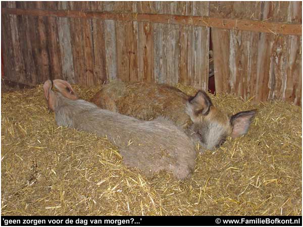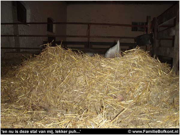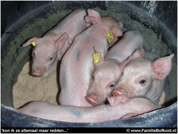 Dat we daar nu uitgerekend die vrijdagmiddag waren! Het moest zo zijn. Ze moest gewoon naar Het Beloofde Varkensland. Een betere plek is er niet. En hoe het nu verder moet? Geen idee. Voorlopig ben ik al blij als Moeke voor haar biggies blijft zorgen en dan zien we wel weer verder. Ik laat ze in absolute rust met elkaar, niemand mag erbij. Eten breng ik snel en dan ben ik weer verdwenen.