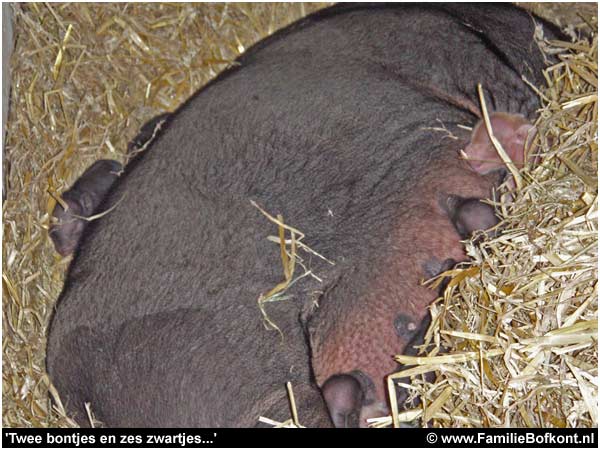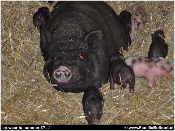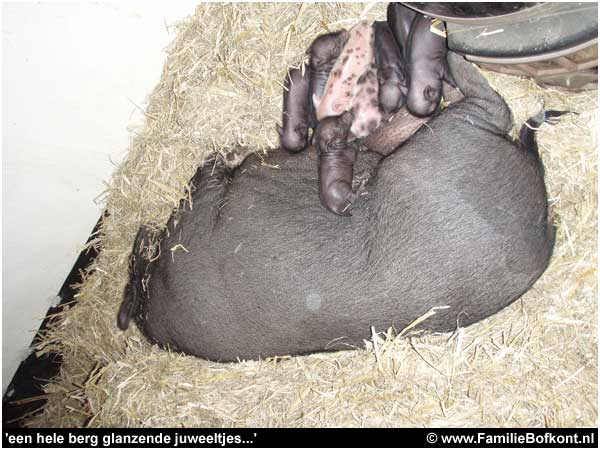13. Ze heeft nu een kraamkamer in de melkerij en is op zondagochtend bevallen van 8 beeldschone biggetjes. 2 bonte en 6 zwartjes. Zelden zo iets moois gezien. Moeder en kinders maken het goed. Ze is erg schuw. Contact maken is er helemaal niet bij. Logisch. Ze heeft zoveel meegemaakt. Eerst hoogdrachtig moederziel alleen achtergelaten in een bos. Toen opgejaagd, gevangen, onder narcose meegenomen in een auto en bijgekomen op een vreemde plek. En een dag later bevallen van 8 kinderen. Ik geef het je te doen. Maar hoe ze er nu bij ligt met al die smakkende mondjes aan die spenen.