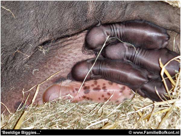 Het gaat goed met Moeke en de biggies. De kleintjes groeien zichtbaar en krijgen steeds meer praatjes. Veel reacties op de weblog. De poezengekken vinden het net kittens, de hondengekken vinden het net puppies. En het is allebei waar. Ik vind het hele kleine mini-mini-mini varkentjes. Alles zit er op en d'r an. De hoefjes, het neusjes, de oogjes die al meteen de wereld in loeren, de oortjes die nog plat tegen de schedeltjes aanliggen, ze zijn werkelijk om op te vreten. Soms piepen ze inderdaad als kleine katjes, dan lijken het wel weer piepende roofvogeljonkies, maar ze kunnen ook al behoorlijk des varkens krijsen als ze willen drinken en het duurt allemaal te lang.