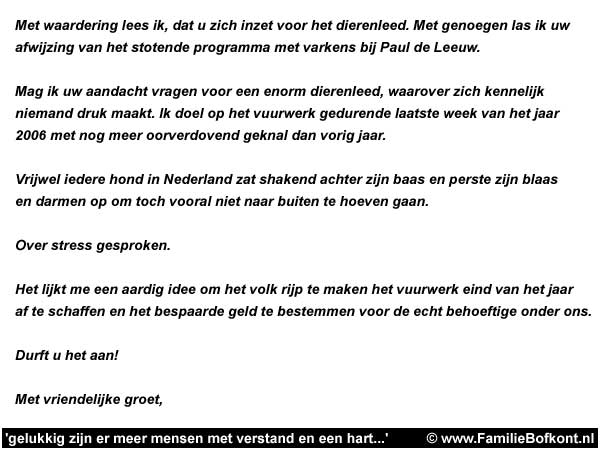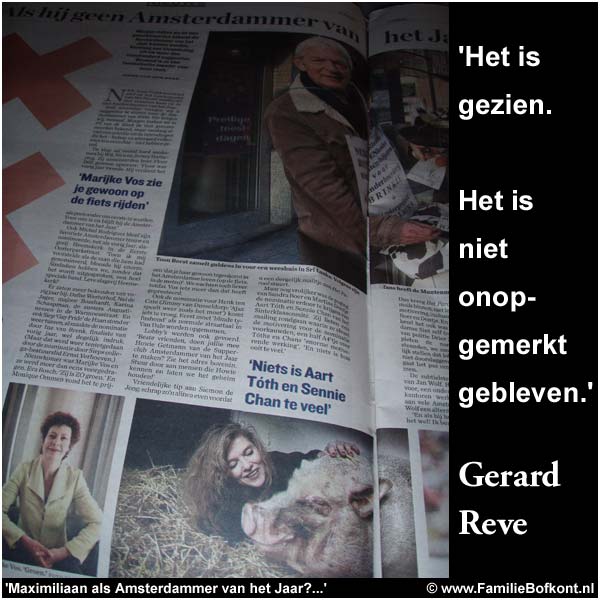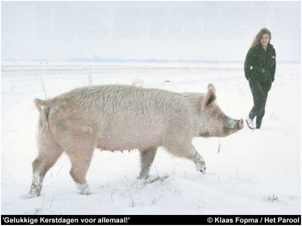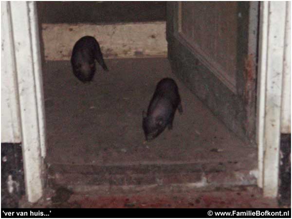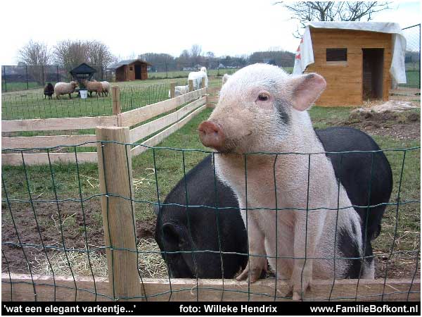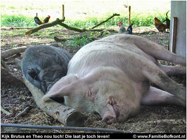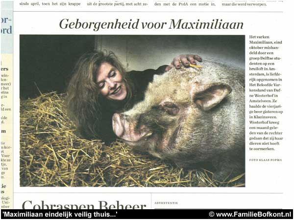 Donderdag 4 januari 2007 De Dag van Reacties Op De Leeuw En Het Varken ![]() Er komen goeie reacties op mijn stuk op Dierennieuws.nl. Gelukkig maar. Ik hoop dat de VARA veel klachten heeft gekregen. Zie hier op Dierennieuws.nl: De Leeuw & het Varken. ![]() Woensdag 3 januari 2007 De Dag van De Varkensbemiddelaar ![]() Het jaar is goed begonnen. Heb gister bemiddeld bij het herplaatsen van een hangbuikzwijntje. Dat is altijd een hele opluchting. Weer een varkentje gered. Verder gaf ik gelegenheid ... Kraambezoek gister van diverse pluimage. Allemaal Familie Bofkont Fans. Myrte - fan van het eerste uur - met haar Family brachten een snoezig Delfts Blauw Biggetje mee met inhoud. Moeke & haar Biggies hebben bergen aandacht gehad. Goed voor de ontwikkeling van de kleintjes. Ze beginnen nu echt aan verschillende mensen te wennen. De mannen stonden buiten een dubbele staldeur te restaureren. Zo hoort het ook. De vrouwen aan het troetelen en mannen aan het zwoegen. Hahaha... Mooie dag! Dinsdag 2 januari 2007 De Dag van De Leeuw En Het Varken ![]() Wie heeft de oudejaarsuitzending van Paul de Leeuw gezien? Ik was des duivels. Dat arme varkentje dat daar zo door hem geschoffeerd werd. En die Yvon Jaspers, die daar maar wat stom stond te grijnzen en te griezelen. "Pas op hoor! Hij kan bijten!" Ja vind je het gek. Dat arme beestje stond stijf van de stress temidden van die joelende massa. Stelletje dombo's. Voor wie er nu helemaal niks van begrijpt, er zaten een paar varkentjes in zijn programma. Een middelgrote hangbuik aan een riem en een paar biggies in een mand. Zo leuk! Ja, ja... Een poosje geleden werd ik voor deze uitzending door de redactie gebeld of ik langs wilde komen met een paar varkens op Oudjaar bij Paul de Leeuw, want een paar mensen hadden de wens om met een varken te kunnen knuffelen. Ik vond dat al zo'n malle vraag, want dan kun je toch gewoon naar Het Beloofde Varkensland toekomen? Kijk hier maar wat ik ze toen per mail heb geantwoord: Aan de redactie van Paul de Leeuw Dag Frederieke, Het zal niet gaan. 't Lijkt misschien leuk, maar voor de varkens is 't dat niet. Integendeel. Een varken is een territoriumgericht dier, dat leeft in een wereld van geuren en klanken. In een vreemde omgeving zijn ze doodongelukkig. Ze hebben zeker een paar dagen nodig om de nieuwe plek te onderzoeken op die vreemde geuren en klanken (Daarna pas zijn ze misschien heel voorzichtig toe aan contact met nieuwe vreemde mensen). De stress die dat met zich meebrengt is enorm (Het varkentje op de poster bij Katja en Georgina in bed was zo panisch, dat het uiteindelijk op de poster is gephotoshopt...). Het vervoer met de vuurwerkknallen onderweg brengt ook nog extra stress met zich mee. Je ziet dat - zelfs al zou je willens en wetens toch varkens in de studio willen hebben - er van een ontspannen contact tussen mens en varken totaal geen sprake kan zijn. Doe het liever niet, in belang van de varkens. Aan de varkenswens wil ik natuurlijk wel van harte meewerken. De 'varkensgekken' zijn welkom op Het Beloofde Varkensland voor een uitgebreide kennismaking met de Familie Bofkont en een varkensmassagesessie. Ik hoor wel wat je daar van vindt. etc. etc. En het dan toch gewoon doen. Die arme dieren, Wat had ik met ze te doen. En Paul er zogenaamd maar leuk op schelden, dat ze zich niet zo aan moesten stellen en Yvonne Jaspers helemaal geshockeerd door hun gegil en die stomme eigenaar die dat allemaal zo maar toeliet. Ik ben dol op Paul de Leeuw. Mensen in de maling nemen die weten waar ze aan beginnen als ze in zijn show komen, is een ding. Maar bij dieren werkt dat niet. Die hebben geen keus. En het publiek maar lachen. Walgelijk om met een programma te willen scoren over de rug van dieren heen! Wat een misselijke vertoning. PS De nieuwe site is natuurlijk (!) nog niet klaar. Altijd veel meer werk dan je aanvankelijk denkt. Dus is Billie Bofkont gewoon al op deze site begonnen aan zijn boek. Komt later in de week wel goed. Maandag 1 januari 2007 De Dag van Het Boek van Billie Bofkont ![]() Namens de hele Familie Bofkont wens ik al onze Varkensvrienden en alle andere leuke mensen een heel goed 2007. De dieren hebben een goede ouderjaarsnacht achter de rug. Toen de klok 12 uur sloeg, ben ik de stallen ingeslopen. Ze lagen allemaal lekker in het stro en dat heb ik maar zo gelaten. Om het erf heen hing een gordijn van aanhoudend vuurwerkgeknal. Gelukkig net ver genoeg om niet angstaanjagend te worden. 1 januari. Een frisse start. We zijn bezig met een nieuwe website. Net zo leuk als de vorige - misschien nog wel veel leuker - maar deze keer met een nieuwe structuur. Dat werd hoog tijd. Het leven is een aaneenschakeling van puinruimen en orde scheppen in de chaos. Zo blijf je lekker bezig en je hoopt maar dat je iedere keer toch een stapje verder komt. Billie Bofkont woont dit jaar 10 jaar op Het Beloofde Varkensland. Hij schrijft er een boek over. Een online boek. Iedere dag een bladzij. 'Je weet nooit hoe lang je nog hebt' zei hij tegen de jonge Gieltje 'en daarom ga ik alles vastleggen voor later.' Vanavond staat de eerste bladzij er dus op. De hele Familie Bofkont verheugt zich enorm op het Billie Bofkont Boek. Wat zal hij veel te vertellen hebben. Rosamunde staat de hele dag al kribbig te kijken, want zij woont hier nog langer dan Billie. Maar ik weet zeker dat Billie dat wel recht gaat zetten in zijn verhaal. Daar is hij beschaafd genoeg voor. Iets anders: Tot mijn verrassing kwam ik mezelf in het Parool tegen met Maximiliaan. Kennelijk ben ik voorgedragen - evenals vorig jaar blijkt nu, ook nooit geweten - als Amsterdammer van het Jaar. De genomineerden-status niet gehaald, maar dat zat er toch niet in, begreep ik uit het artikel. Daar is de Familie Bofkont al te bekend voor en dat is niet de bedoeling van deze verkiezing. Geeft niks. 'De Familie Bofkont is gezien en niet onopgemerkt gebleven', zou Gerard Reve gezegd hebben. Dat is en blijft een goede zaak voor alle dieren die (nog) niet tot De Orde der Bofkonten