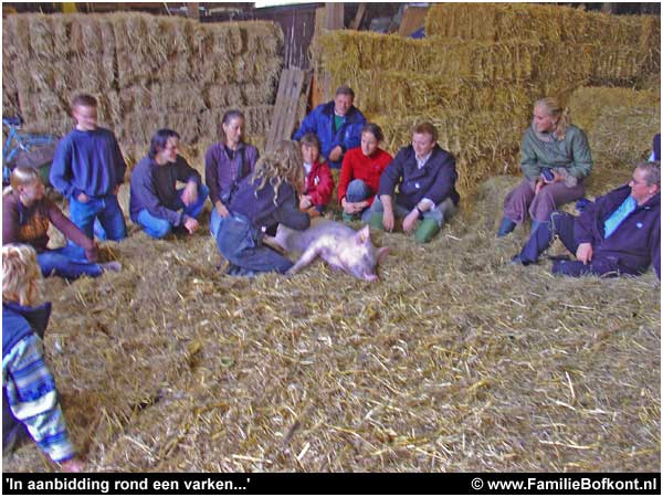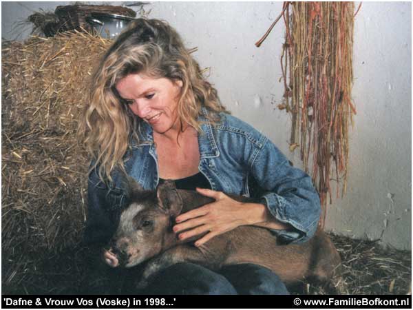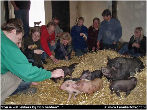 Zondag 21 januari 2007 De Dag van De Hersenschudding & De Hartkloppingen... ![]() Hoi Dafne, Sinds een week of zes zit ik thuis met een zware hersenschudding, maar surf wel dagelijks even over het web. Ben op een of andere manier op je site terecht gekomen en kijk daar sindsdien iedere dag op. Ik word er erg vrolijk van. Heb tegen mijn vriend al gezegd dat ik, zodra ik weer fit ben, zeker een keer wil gaan varken / big masseren o.i.d.. Het opstartscherm van onze computer wordt ook sinds een paar weken opgevrolijkt met een van je foto's van een varken in het zomerzonnetje genietend in een lekkere modderpoel. Je schreef dat je er graag bij zou liggen, ik dacht er precies hetzelfde over. Bovenstaande mail kreeg al weer een poos geleden van een mij onbekend aardig iemand. Wat leuk de Familie Bofkont als troostmedicijn tegen een hersenschudding, dacht ik. Blijkt dezelfde dame hier vanmiddag te zijn met haar vader. Genezen en al. Het werd een moordworkshop. Volle bak, mooie concentratie, de dieren hebben met volle teugen genoten. We zijn begonnen bij Moeke en haar biggen. Die hebben natuurlijk iedereen betoverd. Ze schrikken nu ook niet meer, dus de zijdeur van de melkerij kan weer gebruikt worden. Het stond er zwart, leek wel een popconcert. Prachtig om iedereen zo toegewijd te zien. Daarna zijn we Aagje gaan begroeten dwars door de windpolder heen. Daar stond Madam omringd door haar bewonderaars. Woeste luchten en dan al die mensen om haar heen. Een Bedevaartsoord waardig. Terug door de zompige polder naar de boerderij gerend - wie er het eerste is! Als de chemie klopt in een groep, kan zo'n middag niet meer stuk. En toen... er ontstond een mooie romance tussen een deelneemster en Gieltje. De vrouw was jarig geweest en kreeg de workshop van haar vriendin cadeau, als verrassing. Eerst een mooie kaart met een varken er op en toen ze hoorde dat ze hier heen zou gaan kreeg ze hartkloppingen van opwinding. Ze heeft werkelijk in katzwijm naast Gieltje gelegen. Wat was die vrouw onder de indruk. Ik weet niet of ze een geliefde had, maar die was vast heel erg jaloers geworden bij die romantische aanblik... Zaterdag 20 januari 2007 De Dag van De Engelse Fan Een Engels meisje schreef een leuk briefje: ![]() Vrijdag 19 januari 2007 De Dag van een Varkentje voor Maarten Biesheuvel? ![]() Vorige week stond er groot op de cover van Vrij Nederland dat Maarten Biesheuvel een varkentje wil. Een sympathiek artikel over de schrijver, zijn vrouw, hun solitaire leven en de pas door hem gewonnen P.C.Hooftprijs. Blijkt dat de schrijver een romantisch verlangen heeft naar een varken(tje) als huisdier. Uit het verhaal op te maken betreft het hier een roze varken. Zeg een Brutus, een Aagje, een Gieltje, een Brammetje, een Bonestaakje, een Miss Piggy, een BabyBig. Grote roze lummels dus. Maarten Biesheuvel zag ooit een zeug met biggen aan de trog. Een van de biggetjes sprong over de rand en begon al zwemmend gulzig te eten. Moeder wipte dat biggie er zo met haar neus weer uit. Sindsdien wil hij zo'n roze biggetje... (hij heeft niet het flauwste vermoeden dat dat biggetje net zo'n sterke neus gaat krijgen als moeder en dat daarmee dan de ontbijttafel van Maarten en zijn vrouw tegen het plafond gaat...). Gelukkig wil z'n vrouw Eva het niet. Hij probeert haar nu over te halen... Enfin, onderstaande brief heb ik naar Vrij Nederland geschreven, lees maar:
