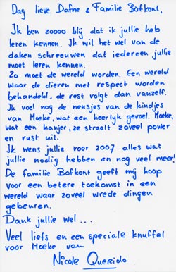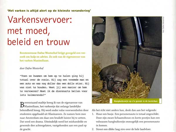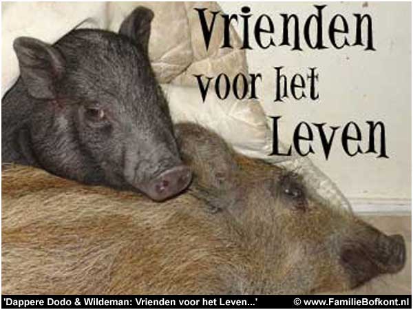 Dafne's nieuwe serie op Dierennieuws.nlNa de succesvolle reeks 'Lessen in Dierengeluk' nu een nieuwe reeks: Dierenliefde is... Donderdag 11 januari 2007 De Dag van Bonaire en Pieterburen ![]() Vandaag verhuizen 2 zwijntjes naar Bonaire. Op dit moment zitten ze in het vliegtuig en ik duim voor ze. Dat heb ik beloofd. Ik heb meegedacht en de baasjes geadviseerd wat er allemaal kwam kijken en hoe het allemaal moest. Dat wist niemand, want officieel mag een zwijntje nog niet eens naar de hoek van de straat, maar zo zie je maar weer. Niet door laten afschrikken en gewoon doen. De papieren zijn uiteindelijk allemaal rond gekomen. Ik heb er vertrouwen in dat het allemaal goedkomt. Verder leuke mail uit Pieterburen. Woensdag 10 januari 2006 De Dag van Het Nieuwe Boeren... ![]() Een hele poos terug werd ik gebeld door een bureau dat in 'groene zaken' bemiddelt. Ambtenaren van het Min. van LNV gaan namelijk in het kader van een werkproject letterlijk de boer op om eens te zien wat er allemaal bij komt kijken voor je de piepers en de gehaktbal op tafel hebt staan. Ze mochten zelf kiezen bij welke boer. En iemand had Het Beloofde Varkensland uitgekozen! Of ik daar aan mee wilde doen? Na afloop wordt er een napraatdag georganiseerd voor de boeren, hun ambtenarenhulpjes en de minister in Den Haag. Natuurlijk wil ik daar aan meedoen. Er worden hier namelijk geen piepers gerooid of varkens vetgemest. Het product en de dienst van deze boerderij heet Dierenwelzijn. Enfin, de ambtenaar in kwestie komt dus straks en schijnt niet vies te zijn van stront ruimen. Dus dat gaan we doen! En we gaan er een heel leuke dag van maken. Dinsdag 9 januari 2007 De Dag van de Aanzoeken ![]() Gister kreeg ik 2 aanzoeken. Een van de Partij voor de Dieren en een van Amsterdam Anders de Groenen. De Provinciale Verkiezingen komen er aan. Groen Links meldde zich vorige keer ook nog als huwelijkskandidaat, maar die weten het al: Ik wil onafhankelijk blijven. Voor de afgelopen Tweede Kamer Verkiezingen heb ik een eenmalige uitzondering gemaakt, omdat ik vond dat de PvdD de kamer in moest. Prompt kwam toen de PvdA met het verzoek om hier met een hele PvdA-Club een workshop varkensmassage te volgen met hun rode Verkiezings-Koe en de pers op hun hielen. Dat had ik nou ontzettend leuk gevonden. Ook al omdat PvdA landbouw-woordvoerder - Harm Evert Waalkens - koeienboer is en Dierenbeschermer van het Jaar. Maar dan zou ik vreemdgaan... en daar ben ik niet van. Dus kon het feest niet doorgaan. Jammer hoor. Nu wil ik weer vrij zijn en gewoon doen net zo het uitkomt en naar wie mijn hart uitgaat. Wellicht een campagne-advies, een wervend stukje schrijven, mogelijk een middagje meefolderen maar alle ondersteuning vanuit alle vrijheid. En als de verzorging van Familie Bofkont dat qua tijd niet toelaat, dan helemaal niet. Het was bomvol bij de verkiezing Amsterdammer van het Jaar. Goed evenement, waar je gewoon geweest moet zijn. Die sfeer hing er en dat is knap om dat voor mekaar te krijgen. Heel flauw, maar kon het niet laten: heb snel een foto van Burgemeester Cohen gemaakt (en ik was niet de enige...) Verwarring alom, want vriendin Merel verwachtte dat ik nog naar voren geroepen zou worden omdat ze gehoord had dat ik genomineerd zou zijn. Ene Said ging er met de titel vandoor en had een gigafanclub meegenomen die de schouwburg bijna afbraken. Hij doet van alles. Regelt gratis chirurgen voor arme kinderen, verzamelt oude rolstoelen, rollators etc, brengt die naar Marokko en zo nog veel meer. Geweldig werk. Leuke avond. Maandag 8 oktober 2007 De Dag van My name is Boar, James Boar... ![]() Prachtige nieuwjaarskaart van Jet Nijkamp. Ze is beeldend kunstenaar en maakt veel fraais, o.a. de tekeningen in het boek 'Filosofie voor de Zwijnen' en de Beroemde-Mannen-met-hoofddoekjes. Ga maar kijken... Dat werd niks gister met de biggies buiten. Ik vond het toch te koud en te ongezellig weer. Zag dat het van de week misschien wel 14 graden kan worden. Wie weet. Ik ga niks forceren. Een zonnetje erbij is toch het beste voor ze. En zo te zien hebben ze het allemaal nog heel erg naar hun zin in de biggencreche. Het leger Verslaafden-aan-Billie Bofkont groeit. Die feedback is heel erg leuk. Ik ben blij. Billie Bofkont komt weer helemaal tot bloei. Vanavond naar het Gala van de Amsterdammer van het Jaar. Dat is kennelijk een heel hip evenement aan het worden. Goed bedacht van het Parool. Helemaal uitverkocht. De Dierenambulance is ook genomineerd. Dat komt heel goed uit. Ik wil ze nog spreken over 'Het Paarse Hangbuikzwijntje'. Dus dat kan dan mooi even in een informele setting. Zondag 7 januari 2007 De Dag van De Verwenpost ![]() Vandaag zijn de poppedijntjes 7 weken. Het is zacht weer zonder wind, dus naar buiten!