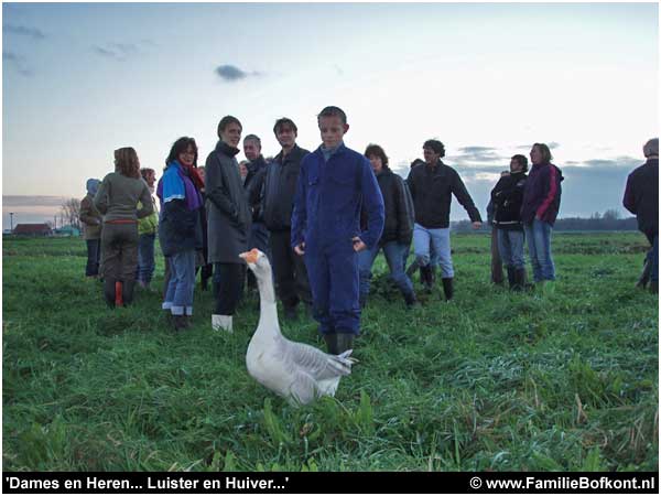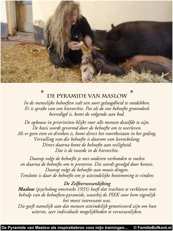 Donderdag 18 januari 2007 De Dag van De Storm & De Pyramide van Maslow ![]() Snel naar het tuincentrum voor een extra voorraad voer voor de Familie Bofkont. Binnen is binnen. Je staande houden op het erf is al een hele toer. Ik heb hier vaker heel zware stormen meegemaakt waarbij de takken om je oren vlogen. Vijf jaar geleden zat ik achter de PC, knalt er ineens een enorme beukentak door het raam. De glasscherven lagen 'all over the place' tot op het toetsenbord. Gek genoeg kwam ik zelf met de schrik vrij. De kabel tussen de bomen met de houten letters van Het Beloofde Varkensland ligt al op de grond. Dat is vaste prik. Zodra het hard gaat waaien, moeten die letters naar beneden, anders komen er ongelukken van. Je moet er toch niet aan denken dat een van de varkens door zo'n ongeleid projectiel geraakt zou worden. Mijn afspraak later op de middag in Utrecht heb ik omgezet. Een omgeslagen rietbusje lijkt me ook niet alles. Moeke was gister al zo onrustig. Nu nog trouwens. De hele dag gillen, mierken en blaffen. De kinders doen vrolijk mee. Zou Moeke de storm aangevoeld hebben? Het zal me niks verbazen. In ieder geval, we zitten lekker allemaal binnen. Warm, droog en veilig. Er is voldoende te eten. Wat wil een mens nog meer? De Familie Bofkont heeft de Pyramide van Maslow uitgevonden... Woensdag 17 januari 2007 De Dag van De Gevonden Tekst ![]() Vond een tekst en heb geen idee waar die ook al weer voor was. Een geschreven interview, zoveel is duidelijk, en de rode woorden zijn correcties van mij, maar van wie is die tekst ook weer en waar heeft dat ingestaan? 't Is wel leuk geschreven zo te zien. Nou ja ik heb er weer een weblog aan, hahaha. [Kop] Blije beestenbende [Streamer 1] "Mijn dieren hebben een naam, een geschiedenis en een persoonlijkheid. Dat betovert mensen. Ik krijg ook post voor mijn gans Arie Bombarie" [Streamer 2] "Toen ik me inschreef voor de boerenschool dachten ze dat mens is gek, zal wel een modegril zijn uit Amsterdam" [Lead] Tussen Amstelveen en Uithoorn ligt de hobby boerderij van Dafne Westerhof die de veelzeggende naam 'Het Beloofde Varkensland' draagt. Hier woont de Familie Bofkont, dieren die door Westerhof zijn vrijgekocht uit de bio-industrie of die na een geschiedenis van mishandeling een gelukkig thuis hebben gevonden op de boerderij. Door middel van voorlichting strijdt Westerhof vanaf haar boerderij tegen het dierenleed in de bio-industrie. Een bijzonder initiatief van een bijzondere vrouw. [Tekst] Zodra je het terrein van Het Beloofde Varkensland betreedt wordt al snel duidelijk wat deze boerderij zo anders maakt. Op het erf lopen alle leden van de Familie Bofkont los op het terrein rond. Een dolenthousiaste gans met de karakteristieke naam Arie Bombarie klapt druk met zijn vleugels en stoot hysterisch kreten uit ter begroeting. Arie Bombarie is slechts een van de dertien gastheren en gastdames. Want zo ziet Dafne Westerhof het graag. "Wij zijn op bezoek bij hen, de dieren zijn hier de baas en wij passen ons aan hén aan.", benadrukt ze in de introductie van de Workshop Dierenliefde waarvoor we ons verzameld hebben op deze zonnige, maar koude zondagmiddag. Het is een bijzonder stel mensen dat van heinde en verre op de Workshop Dierenliefde is afgekomen. Je zou half om half verwachten dat alleen 'geitenwollensokken' en hardcore dierenliefhebbers de tijd nemen om een boerderij als deze te bezoeken. Niets blijkt minder waar. Zo heeft een van de deelneemsters Paula haar hele familie, inclusief opa en oma, meegesleurd en viert ze vandaag haar verjaardag. Een aantal van de aanwezigen is zelfs 'ontvoerd' en heeft nog geen idee wat ze precies komen doen op een boerderij die beloofd hét varkensland te zijn. "Ik ben altijd al gek geweest op varkens", vertelt een vrouw uit Amsterdam. "Vraag me niet waarom. Maar dat uitte zich door het verzamelen van varkensspullen: kopjes, schilderijtjes, beeldjes, kussentjes, áls er maar varkentjes op stonden. Ik heb zelfs op een bepaald moment mijn muren roze geverfd. Het meeste heb ik weg moeten doen van mijn huidige partner. Op je zestiende is het nog leuke hobby, maar als je vijfendertig bent vinden mensen het minder schattig." Als verrassing heeft een vriendin haar vandaag meegetroond. Wanneer Dafne de onwetenden onthuld dat zij vandaag niet alleen haar beestenbende zullen ontmoeten, maar ook de eigenzinnige varkensdames Aagje en Vrouw Vos zullen gaan masseren gaat er een zenuwachtig gegiechel op. Hoewel ze fel tegen het dierenleed in de bio-industrie is, noemt Dafne Westerhof zichzelf realistisch. "Ik weet dat het nooit zo ver zal komen dat mensen helemaal geen vlees meer eten, waar ik voor strijd, is dat mensen alleen nog scharrelvlees eten." Onder andere door de workshop van vandaag hoopt ze mensen op de hoogte te kunnen stellen van de gruwelijke tactieken die in de bio-industrie op beesten wordt toegepast. De aanpak die ze hiervoor bedacht heeft is een uitgebreide kennismaking met haar beestenbende. De hangbuikzwijntjes Mannetje Bromsnor, Miss Universe, Stalker, Lady Lolita, de varkens Miss Piggy, Aagje, Vrouw Vos, Brutus en Maximiliaan, haar koeien Rosamunde en Brutale Griet, gans Arie Bombarie en ram Caesar. Kortom: de Familie Bofkont. Achter elk lid van de familie steekt een aandoenlijk of hartverscheurend verhaal. Het individualiseren van de dieren op deze manier heeft bijna iets hilarisch. "Mijn dieren hebben inderdaad een naam, een persoonlijkheid en een geschiedenis. Maar het is niet zo dat ik denk 'goh kijk mij hier eens leuk doen'. Het is geen koketterie, het is me ernst. Nou is het wel zo dat ik een theaterachtergrond heb, dus ik heb ogen en oren voor dat soort dingen en ik kán het vertellen. Dat besef ik me dondersgoed. En doordat ik die verhalen vertel wanneer mensen bij de dieren staan, krijgen de beesten bezieling. Ze gaan leven voor hen. Er komt bijvoorbeeld ook gewoon post voor Arie Bombarie of Maximiliaan Westerhof! Het betovert de mensen blijkbaar." Na een korte introductie van haar dieren verplaatsen w