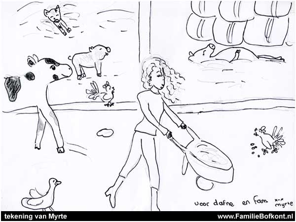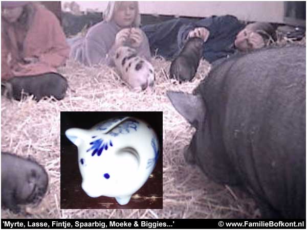 ze een hele grote buitenbox. Ze kunnen er zo vanuit de biggencreche inlopen.Zometeen zet ik de deur open... Camera's in de aanslag... Ben heel benieuwd... Ik kreeg van de week echte verwenpost. Een fraai varkensportret met een bijzondere tekst achterop. Afzender Nicole Querido (die hier al 2 keer was). Ze heeft een heel leuke site - lapria.nl - waar van alles op te ontdekken is. Zij is ook degene die Gieltje en mij heeft voorgedragen op gubba.nl voor het Top 21 personen lijstje. Familie Bofkont heeft er dus weer een ambassadeur bij. Nog meer verwenpost: Twee tekeningen van grote Miss Piggy-fan Myrte. Ze was hier van de week met haar eigen Family en dat heeft een paar te gekke kleurplaten opgeleverd. Binnenkort op deze site.
