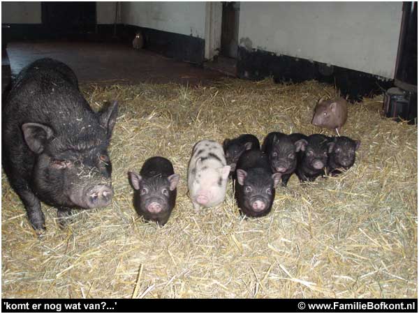 De Dag van De Biggenverslaafden BIGGENVERSLAAFDE 1 "Ik hoop dat jij goede thuizen vindt voor de hangbuikkinderen en natuurlijk voor hun moeder. Maar voor het zover is ga ik nog flink van ze genieten want wat zijn ze leuk en mooi en ze worden steeds leuker. Wat zal ik ze missen als ze weg zijn!! Datzelfde geldt voor jou denk ik. Je had het natuurlijk liever niet gehad maar nu ze er toch zijn geniet je er ook met volle teugen van. Als ik de ruimte, tijd en geld zou hebben zou ik ze allemaal wel willen hebben. Gistermiddag zat Harrie voor het oog van de camera bovenop een van z'n zusjes, de kleine viespeuk. Ben veel minder productief op m'n werk de laatste tijd. Denk dat ik flink moet gaan overwerken de komende tijd maar dat moet dan maar..." BIGGENVERSLAAFDE 2 Vrouw Bofkont, Tsjezus, wat een leven heb jij toch! Midden op de dag, midden in de werkweek, lig jij gewoon - alsof het niets - is in het stro te dollen met de biggen!. De piepers zien er patent uit, met hun stevige buikjes. Het spikkelmadammeke houdt me langer aan de beeldbuis dan goed voor me is, en voor voor de baas. Nou ja, vooruit maar... Klik op artikel rechts voor vergroting Vrijdag 12 januari 2007 De Dag van De Kleurplaat ![]() Hier vast een kleurplaat van Myrte. Dat varkentje dat daar zo heerlijk op z'n rug ligt... Wat leuk gedaan! Dierenliefde is... lang niet altijd knuffelen (1)